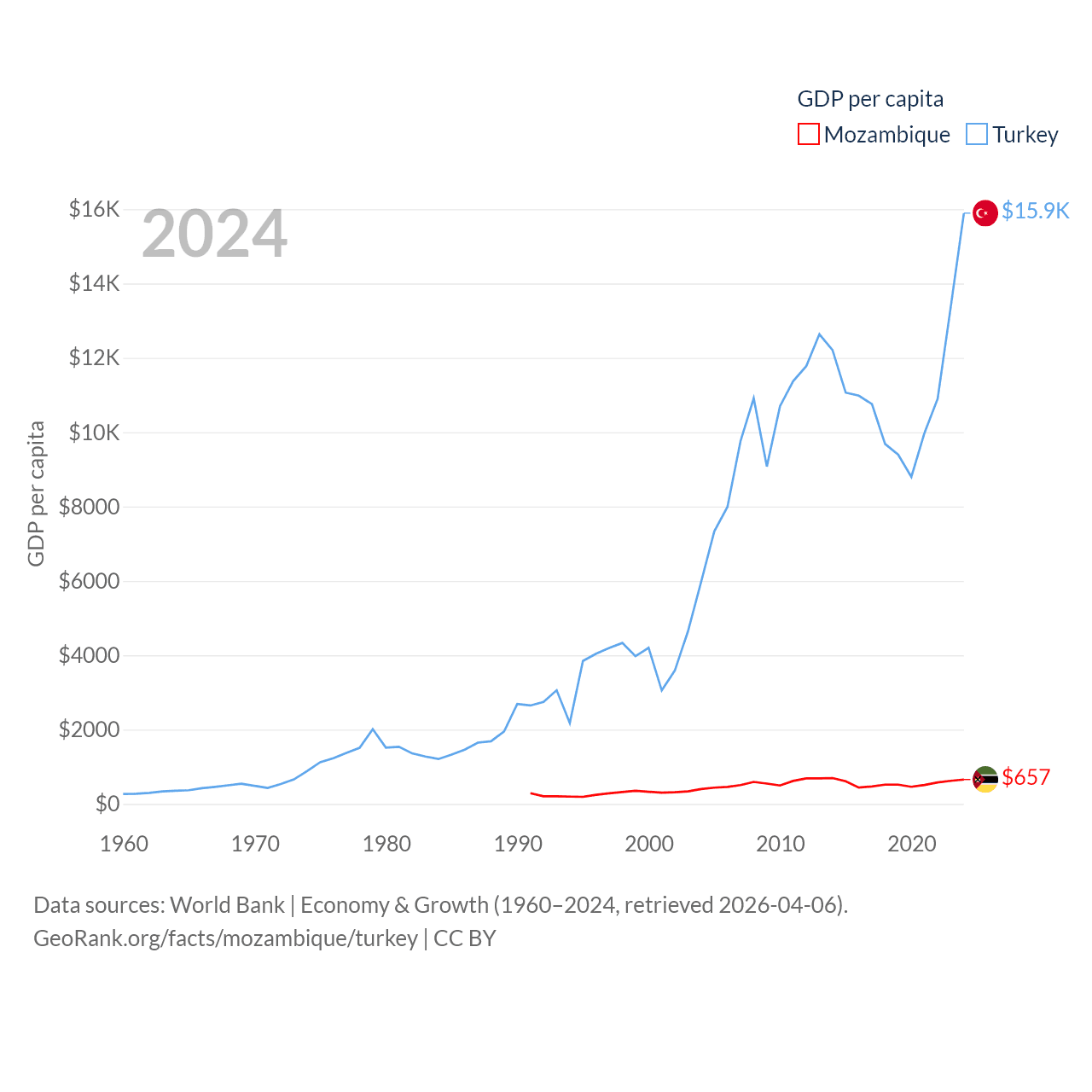 By GDP, Mozambique ranks 123/197 ($22.7B) and Turkey ranks 17/197 ($1.36T). By GDP per capita, Mozambique ranks 189/197 ($657), while Turkey ranks 66/197 ($15,893).