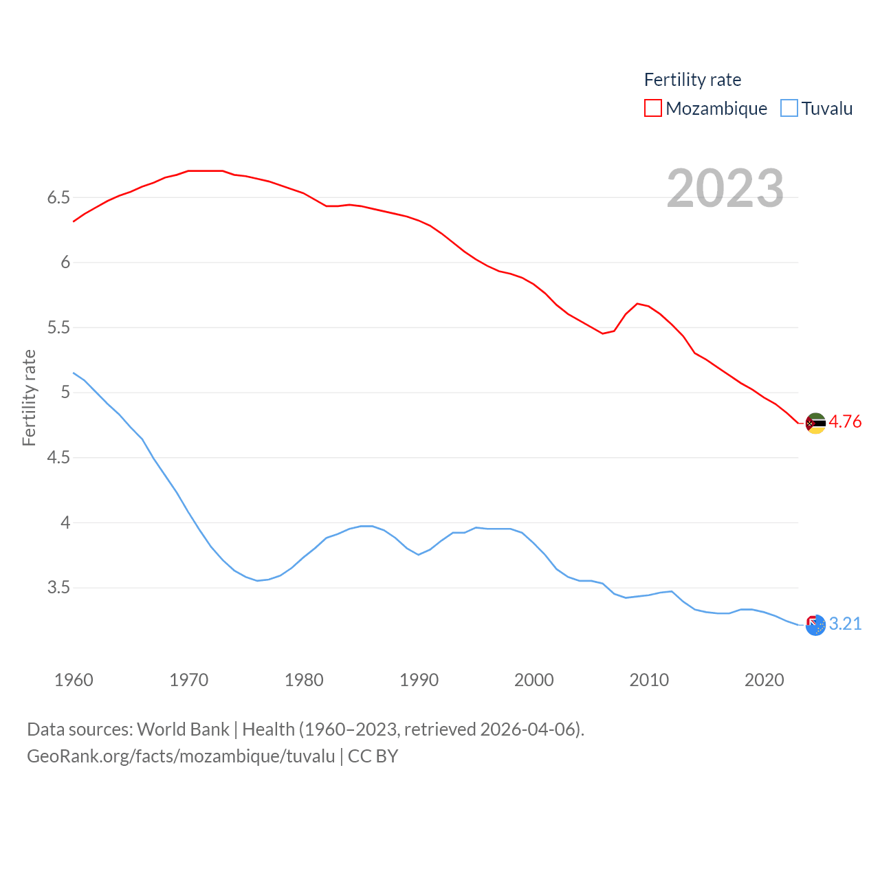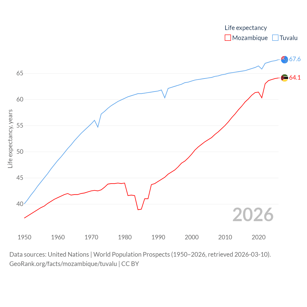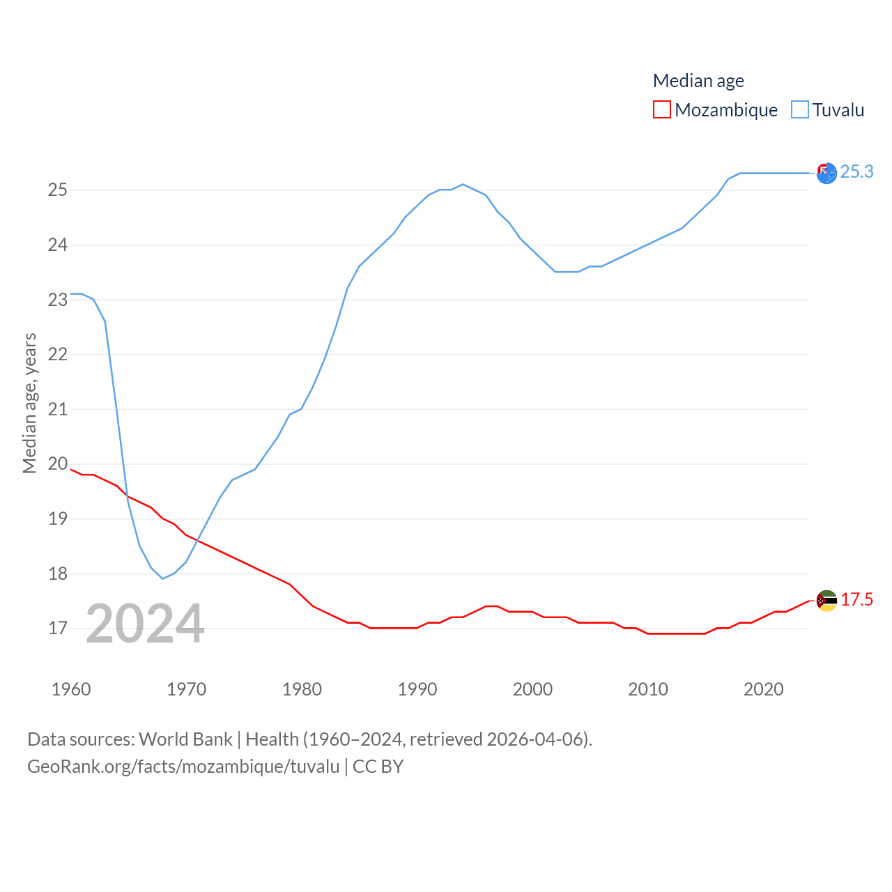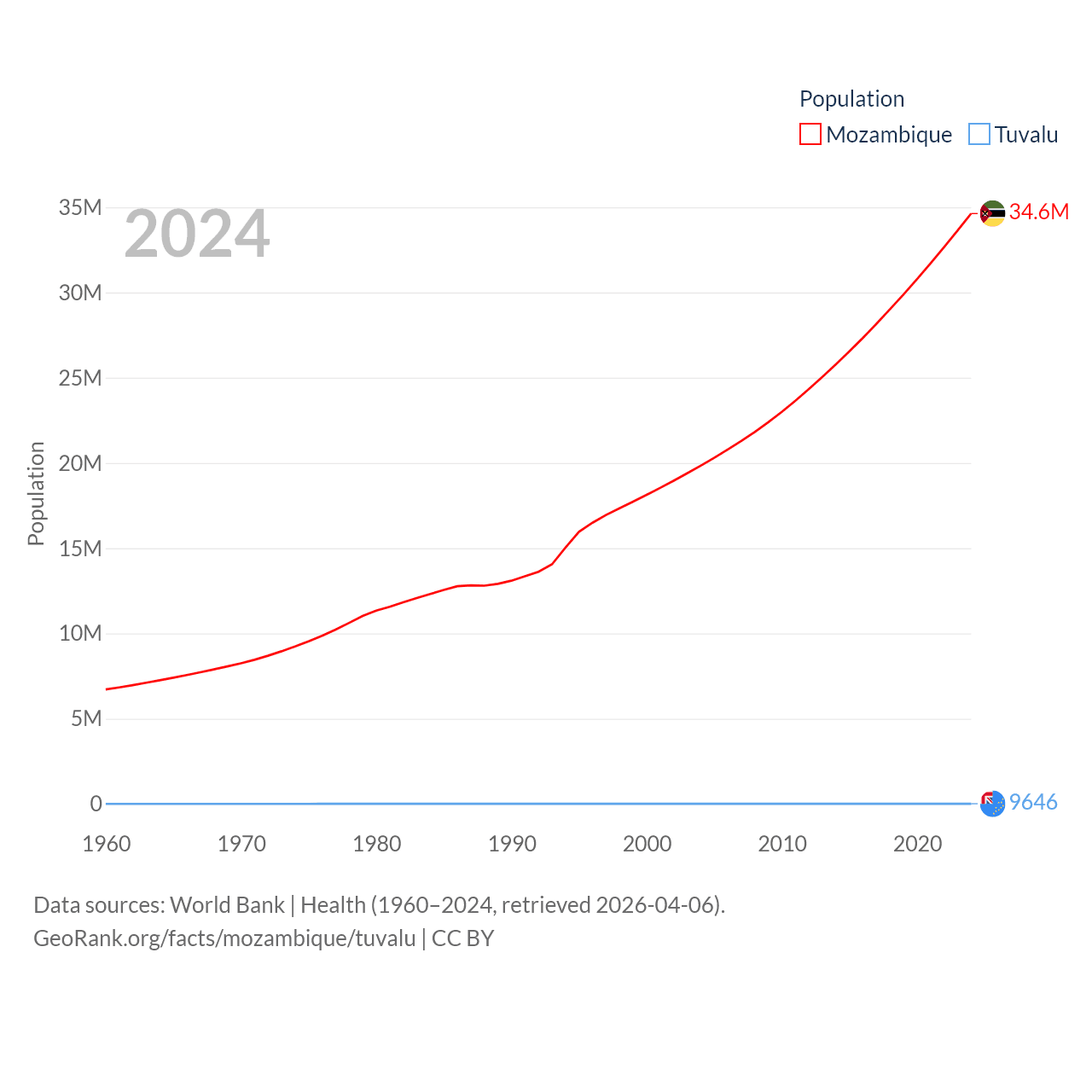Mozambique has a population of 34.6M (ranked 46/197), compared with 9.65K in Tuvalu (ranked 196/197). Mozambique's land area is 303,623 sq mi versus 11.6 sq mi for Tuvalu (ranked 34th vs. 194th).