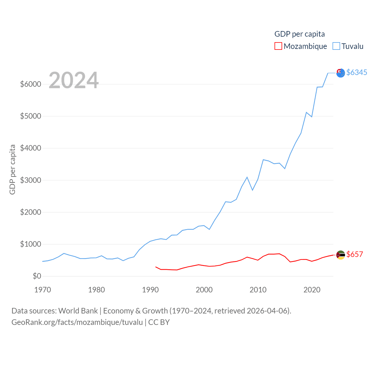 By GDP, Mozambique ranks 123/197 ($22.7B) and Tuvalu ranks 196/197 ($62.3M). By GDP per capita, Mozambique ranks 189/197 ($657), while Tuvalu ranks 110/197 ($6,345).