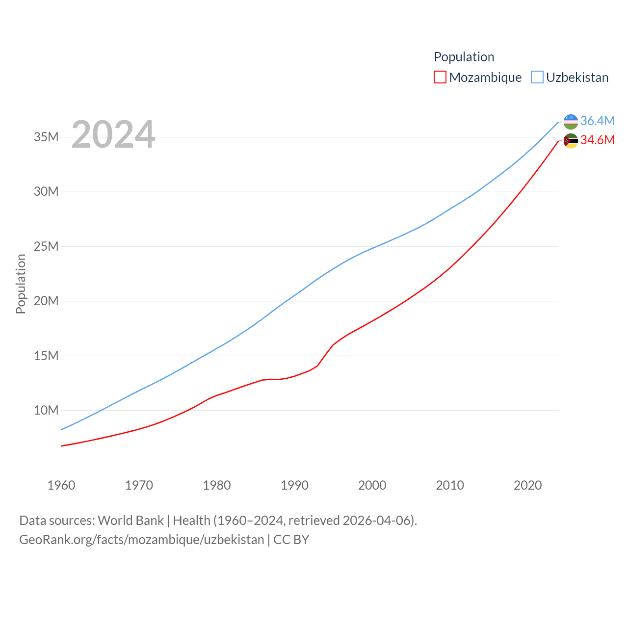 Mozambique has a population of 34.6M (ranked 46/197), compared with 36.4M in Uzbekistan (ranked 43/197). Mozambique's land area is 303,623 sq mi versus 170,136 sq mi for Uzbekistan (ranked 34th vs. 56th).