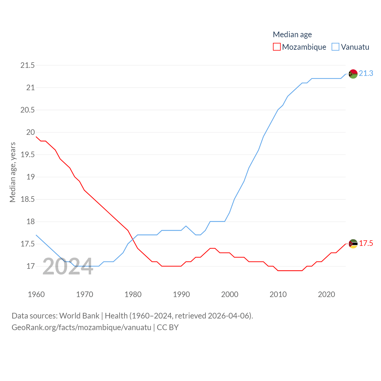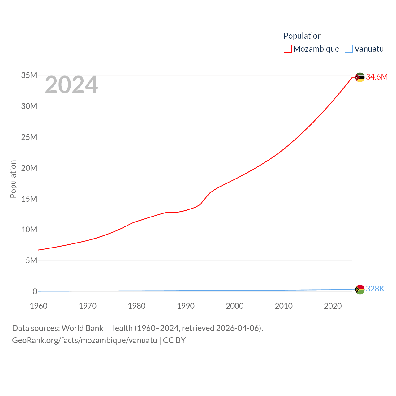 Mozambique has a population of 34.6M (ranked 46/197), compared with 328K in Vanuatu (ranked 174/197). Mozambique's land area is 303,623 sq mi versus 4,707 sq mi for Vanuatu (ranked 34th vs. 157th).