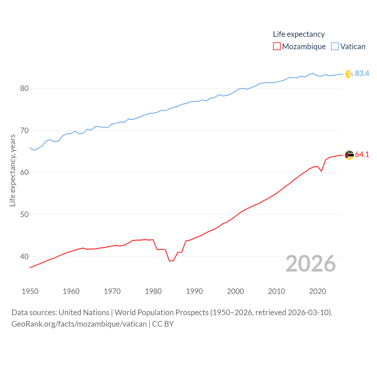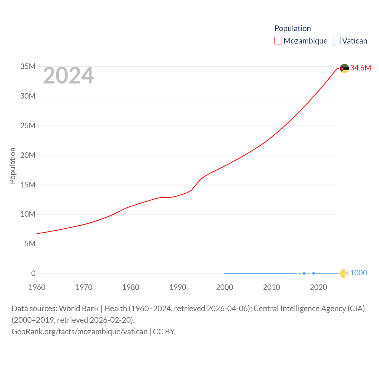 Mozambique has a population of 34.6M (ranked 46/197), compared with 1K in The Vatican (ranked 197/197). Mozambique's land area is 303,623 sq mi versus 0.17 sq mi for The Vatican (ranked 34th vs. 197th).