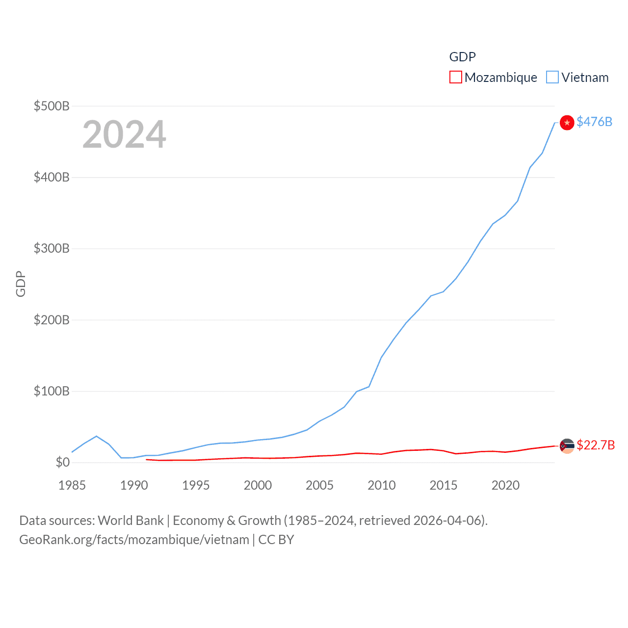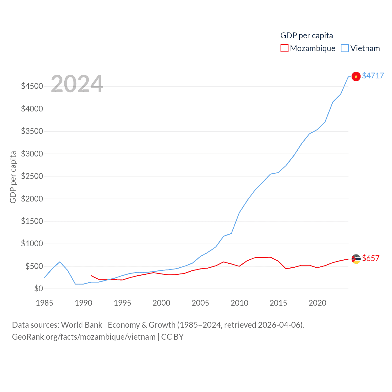 Data sources: World Bank | Economy & Growth (1985–2024, retrieved 2026-04-06).