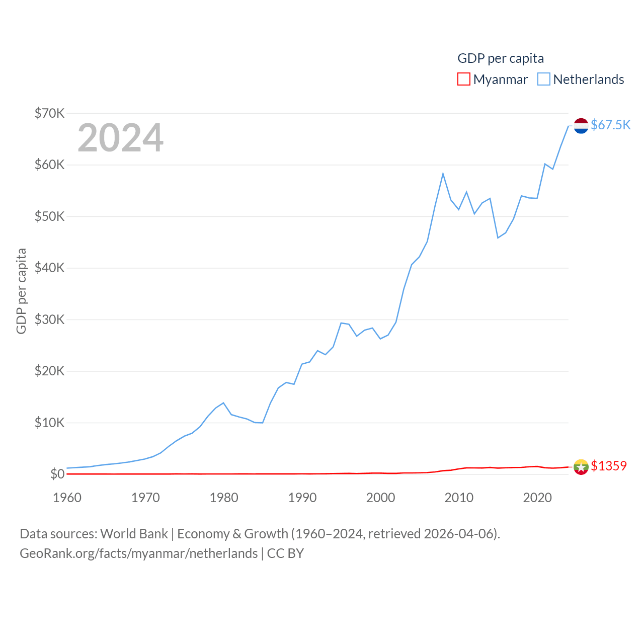 By GDP, Myanmar ranks 85/197 ($74.1B) and The Netherlands ranks 19/197 ($1.21T). By GDP per capita, Myanmar ranks 165/197 ($1,359), while The Netherlands ranks 13/197 ($67,520).