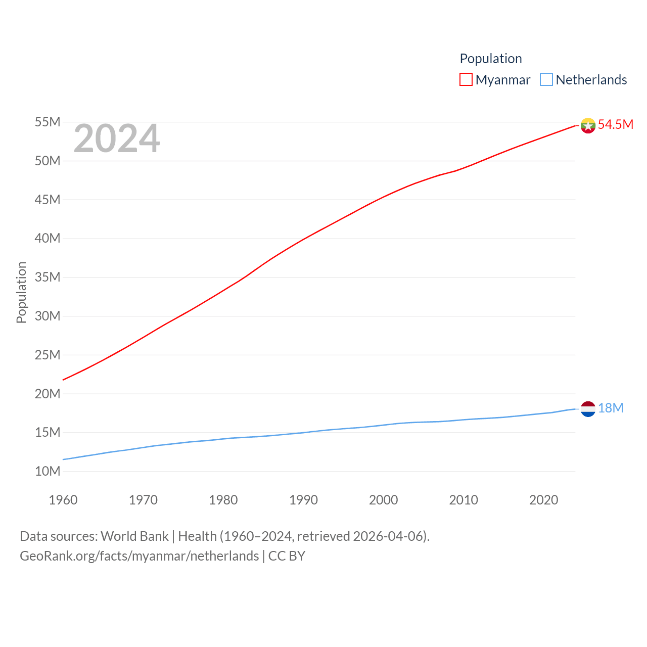 Myanmar has a population of 54.5M (ranked 27/197), compared with 18M in The Netherlands (ranked 72/197). Myanmar's land area is 251,997 sq mi versus 13,000 sq mi for The Netherlands (ranked 39th vs. 134th).