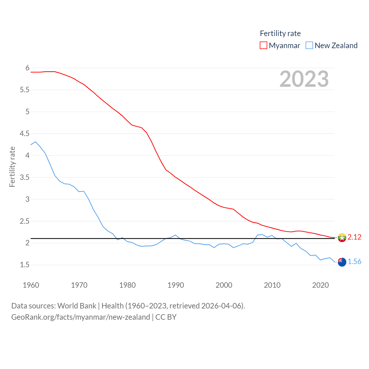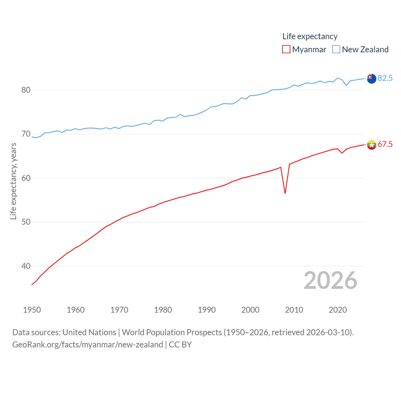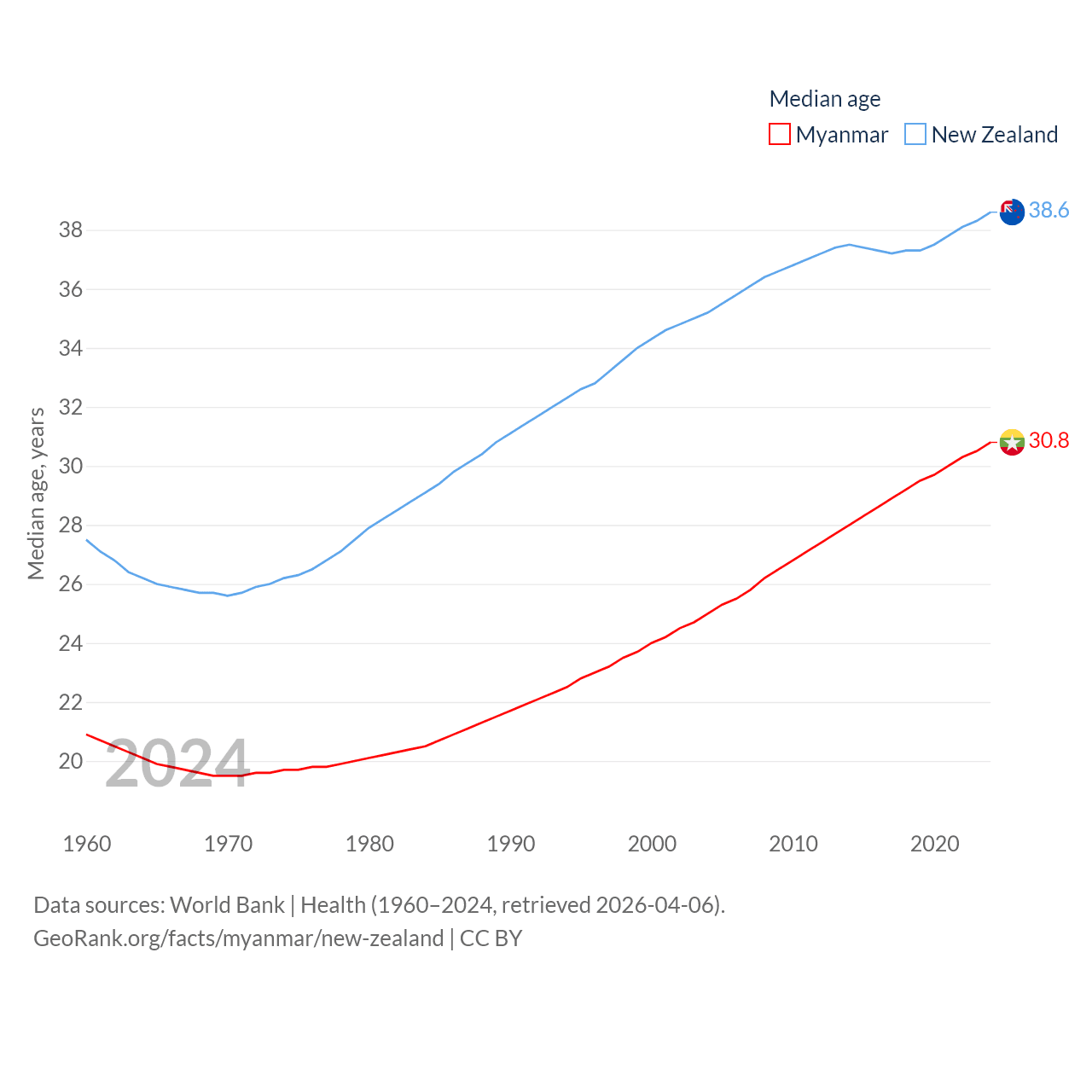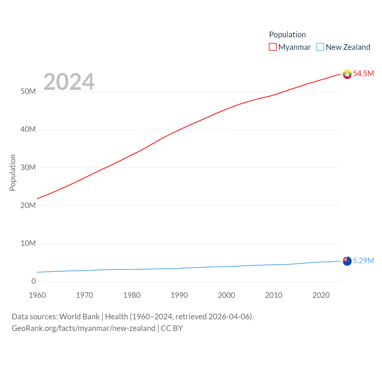 Myanmar has a population of 54.5M (ranked 27/197), compared with 5.29M in New Zealand (ranked 123/197). Myanmar's land area is 251,997 sq mi versus 101,665 sq mi for New Zealand (ranked 39th vs. 74th).