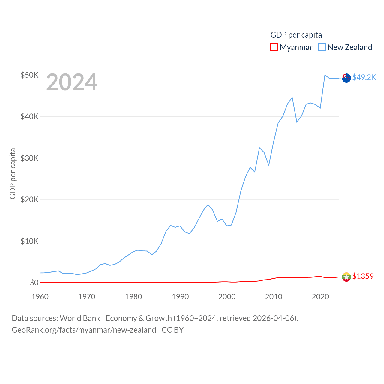 By GDP, Myanmar ranks 85/197 ($74.1B) and New Zealand ranks 52/197 ($260B). By GDP per capita, Myanmar ranks 165/197 ($1,359), while New Zealand ranks 26/197 ($49,205).