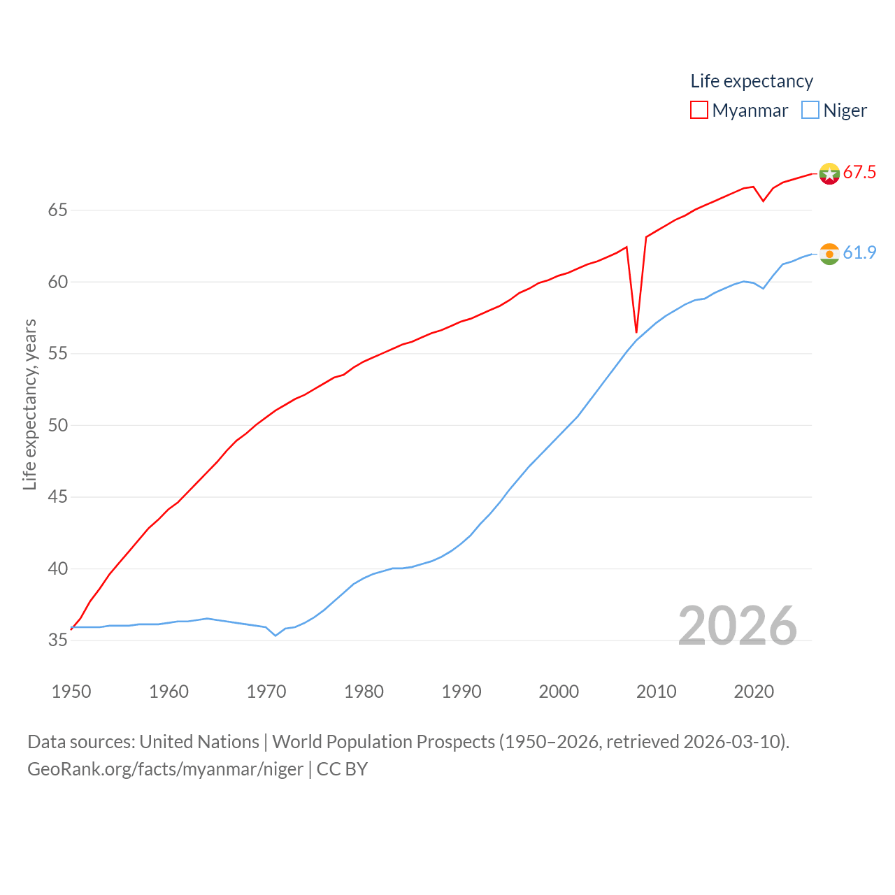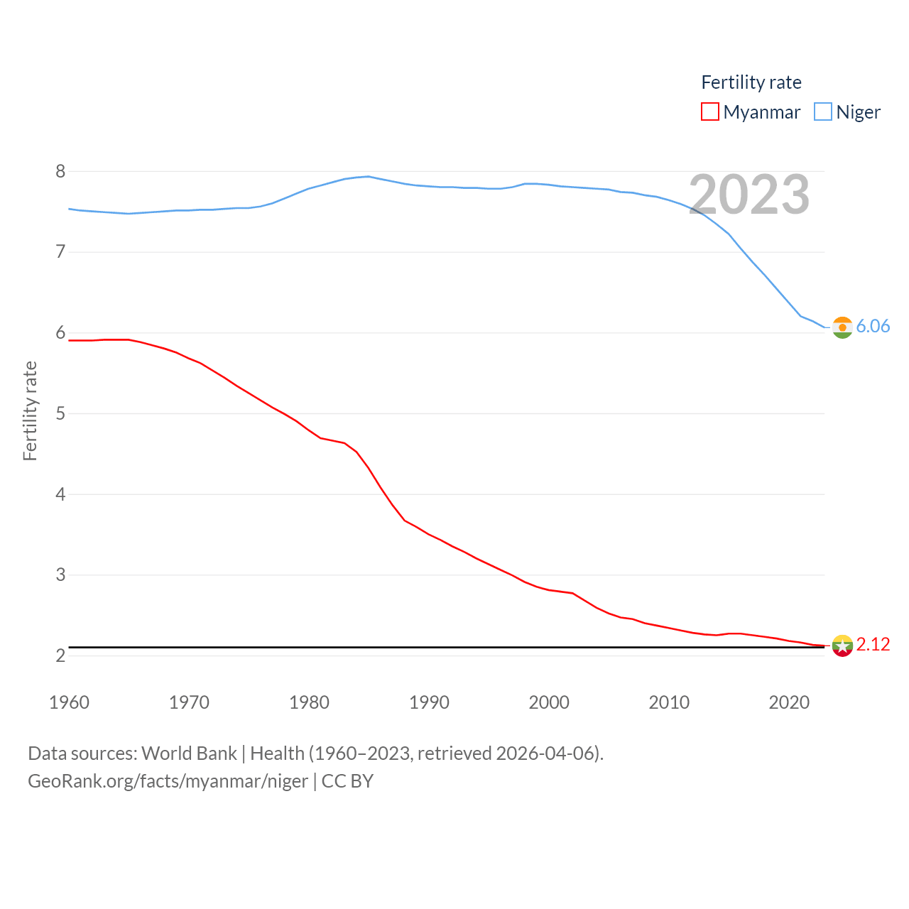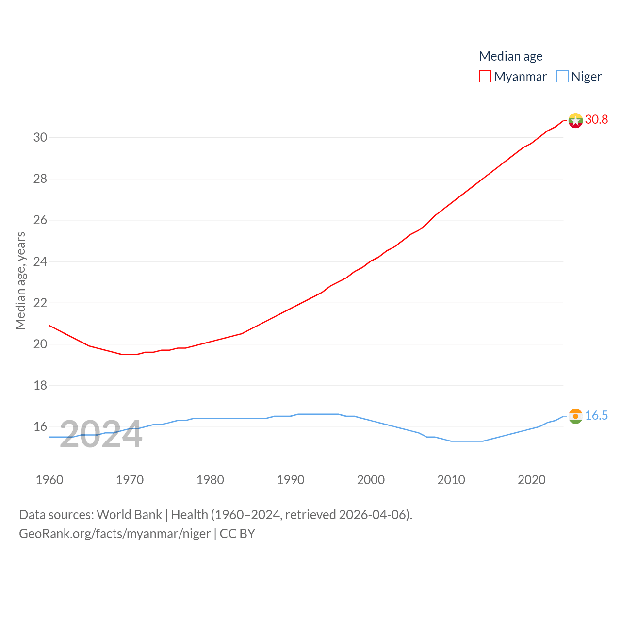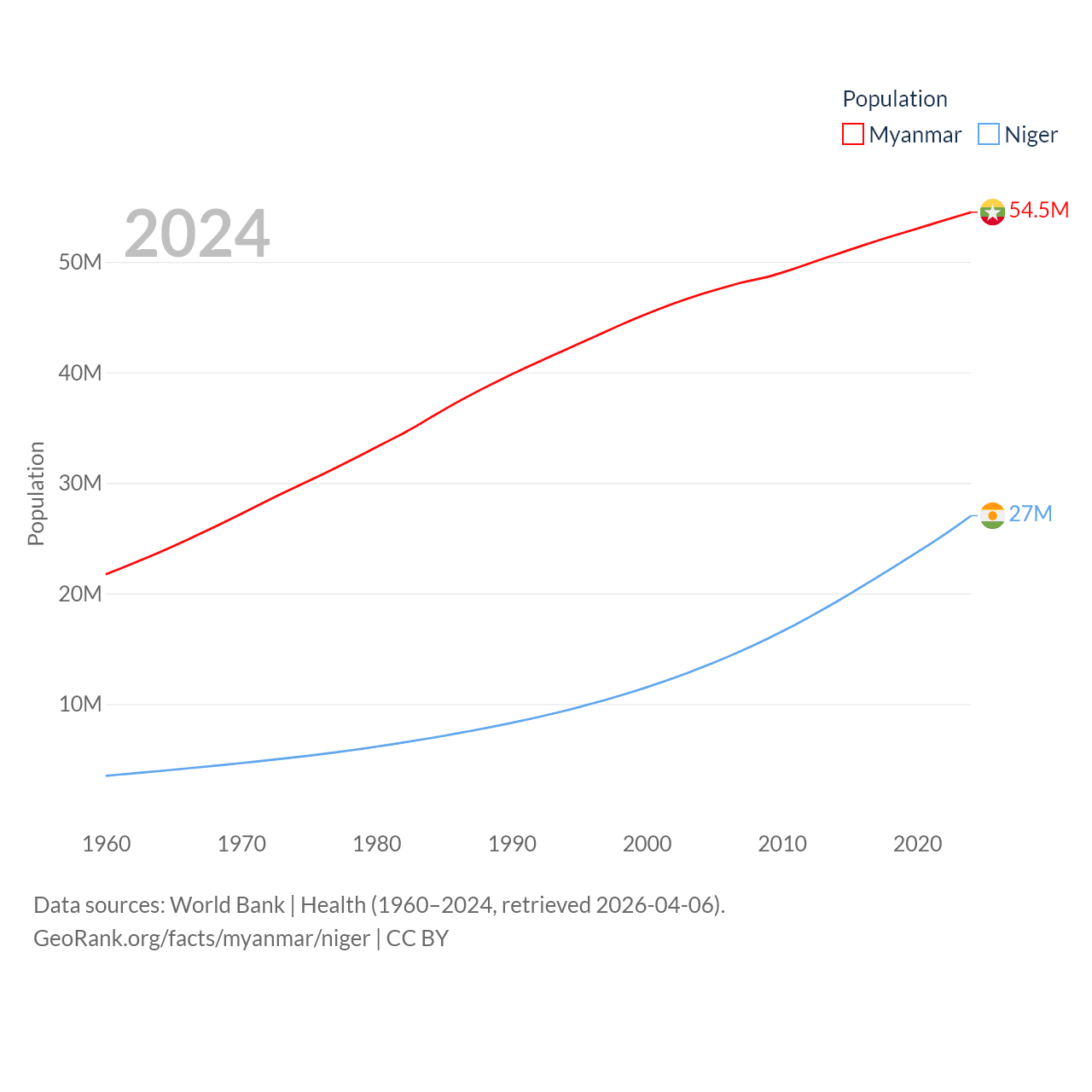Myanmar has a population of 54.5M (ranked 27/197), compared with 27M in Niger (ranked 55/197). Myanmar's land area is 251,997 sq mi versus 489,076 sq mi for Niger (ranked 39th vs. 20th).