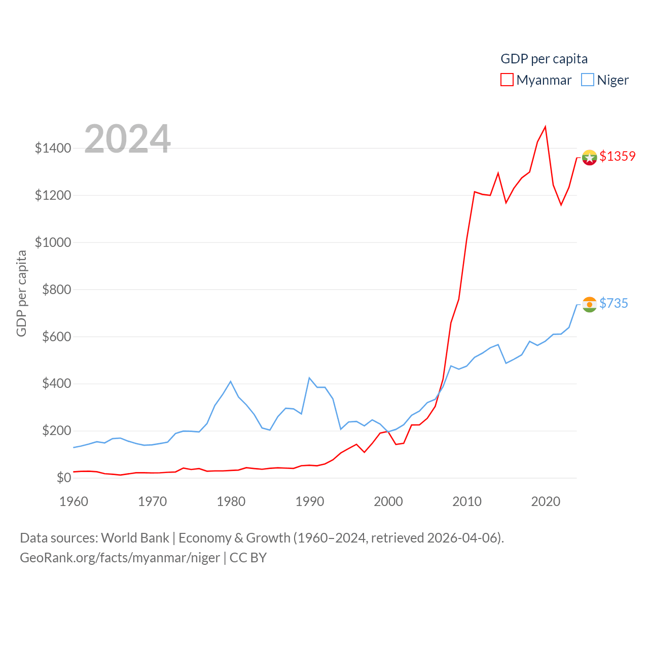 By GDP, Myanmar ranks 85/197 ($74.1B) and Niger ranks 130/197 ($19.9B). By GDP per capita, Myanmar ranks 165/197 ($1,359), while Niger ranks 187/197 ($735).