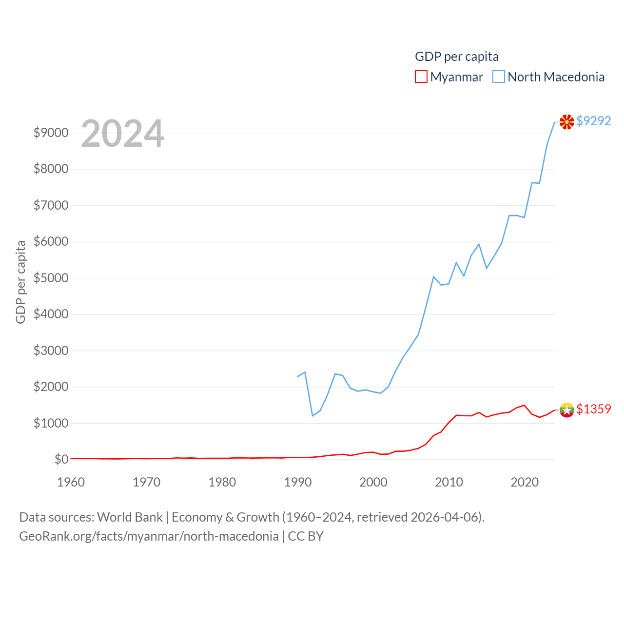 By GDP, Myanmar ranks 85/197 ($74.1B) and North Macedonia ranks 138/197 ($17B). By GDP per capita, Myanmar ranks 165/197 ($1,359), while North Macedonia ranks 88/197 ($9,292).