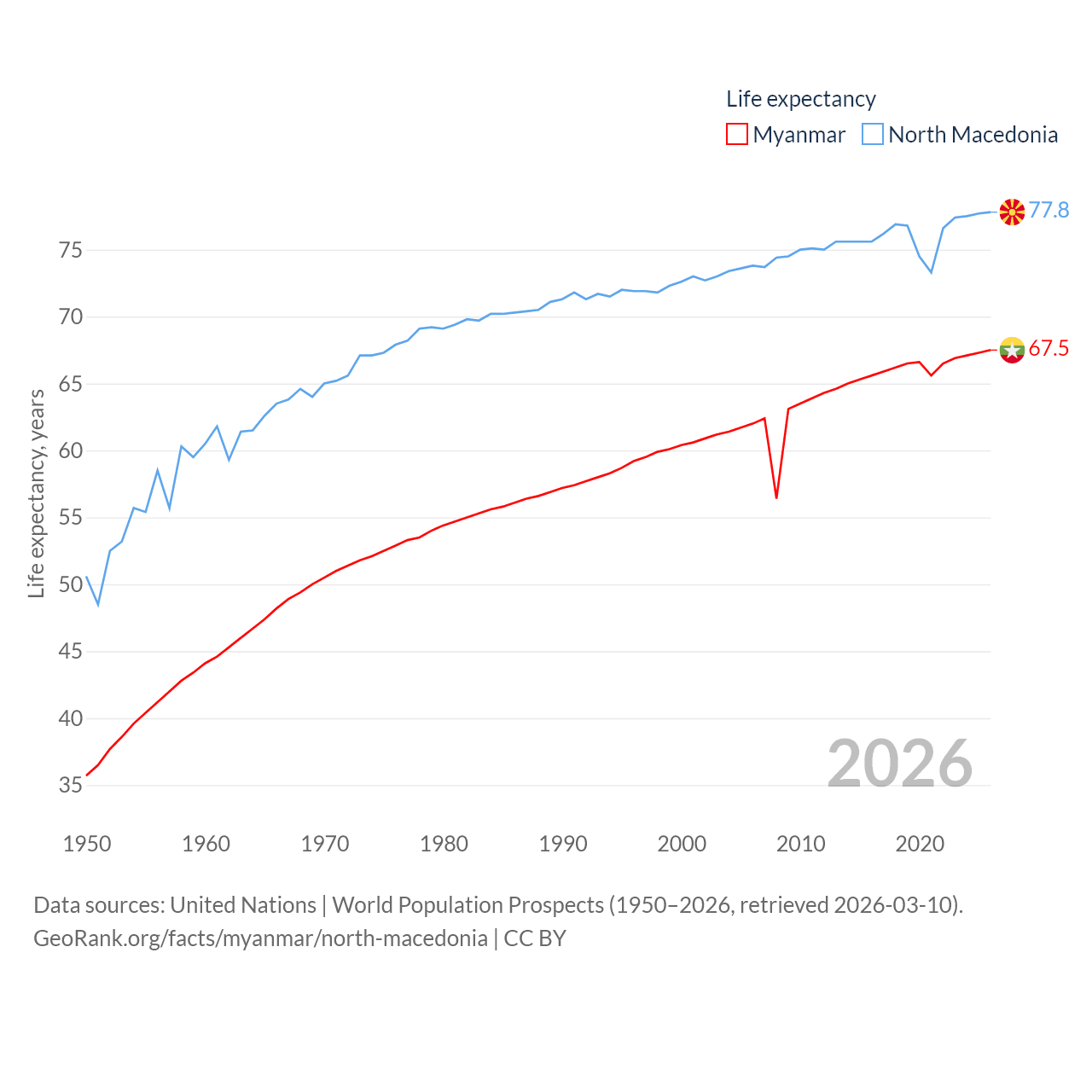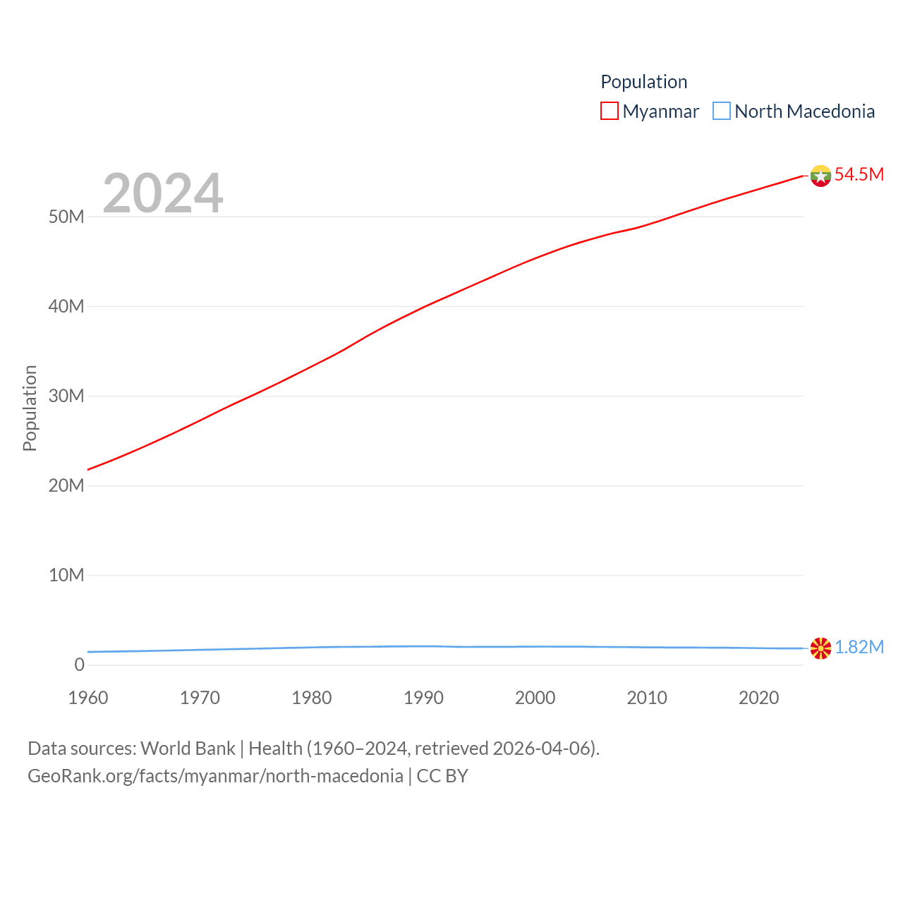 Myanmar has a population of 54.5M (ranked 27/197), compared with 1.82M in North Macedonia (ranked 150/197). Myanmar's land area is 251,997 sq mi versus 9,737 sq mi for North Macedonia (ranked 39th vs. 145th).