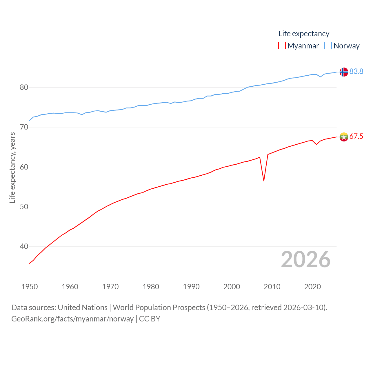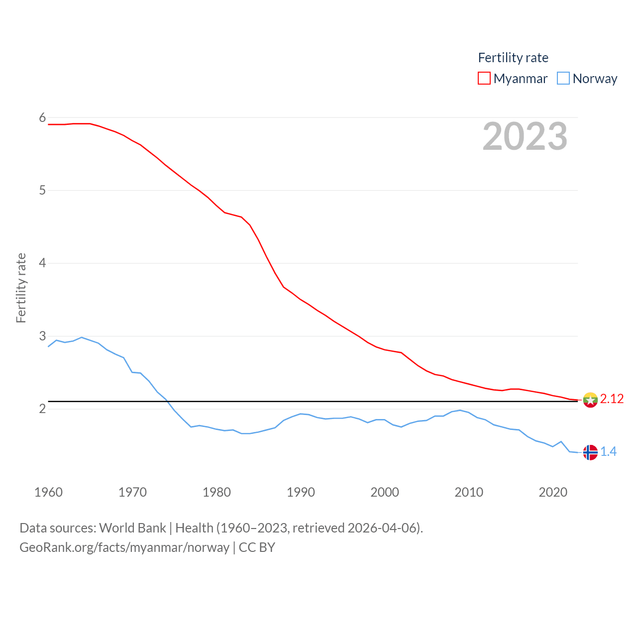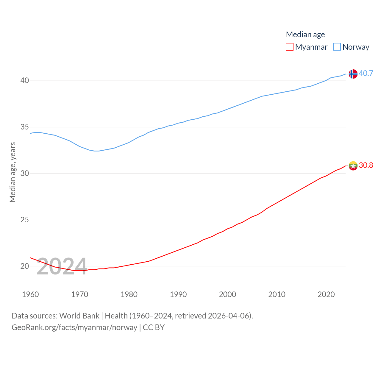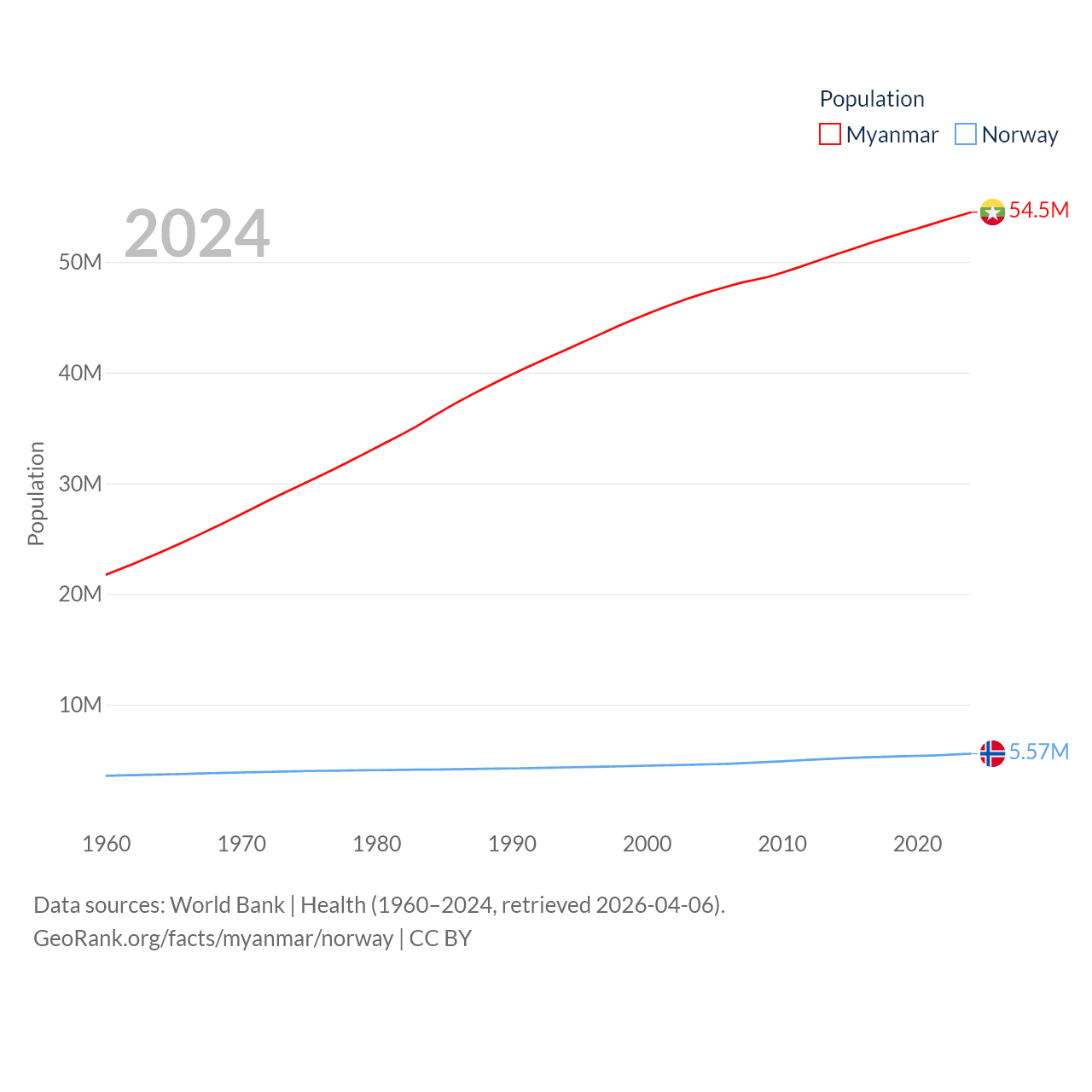 Myanmar has a population of 54.5M (ranked 27/197), compared with 5.57M in Norway (ranked 118/197). Myanmar's land area is 251,997 sq mi versus 140,645 sq mi for Norway (ranked 39th vs. 62nd).