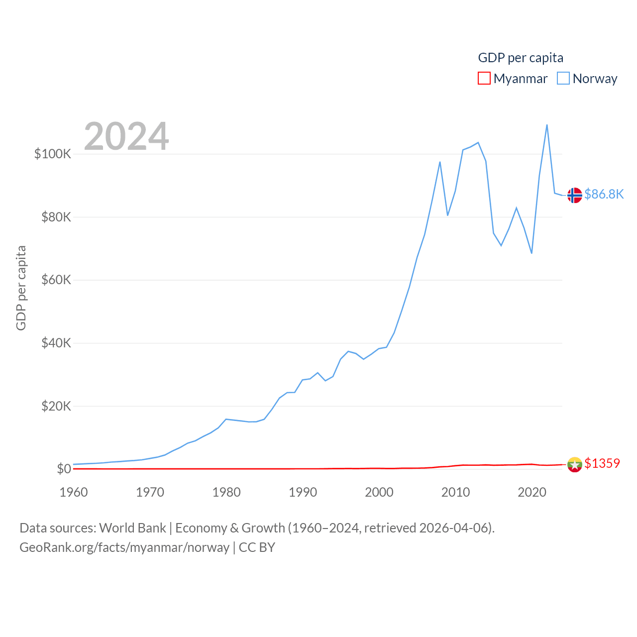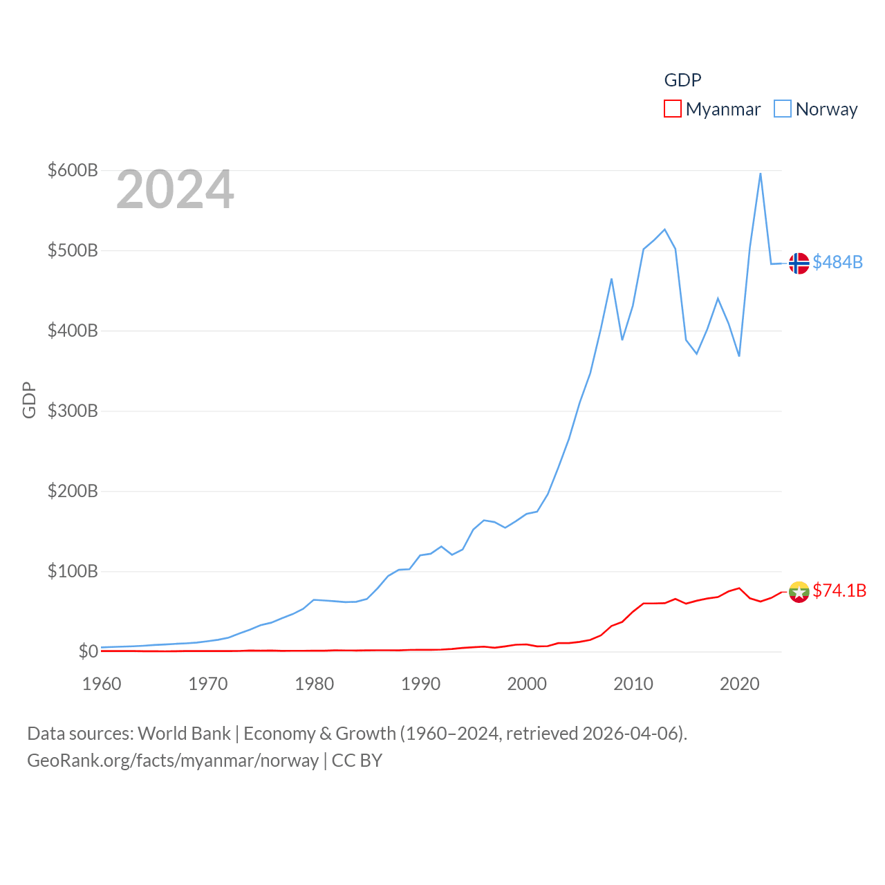 By GDP, Myanmar ranks 85/197 ($74.1B) and Norway ranks 32/197 ($484B). By GDP per capita, Myanmar ranks 165/197 ($1,359), while Norway ranks 8/197 ($86,785).