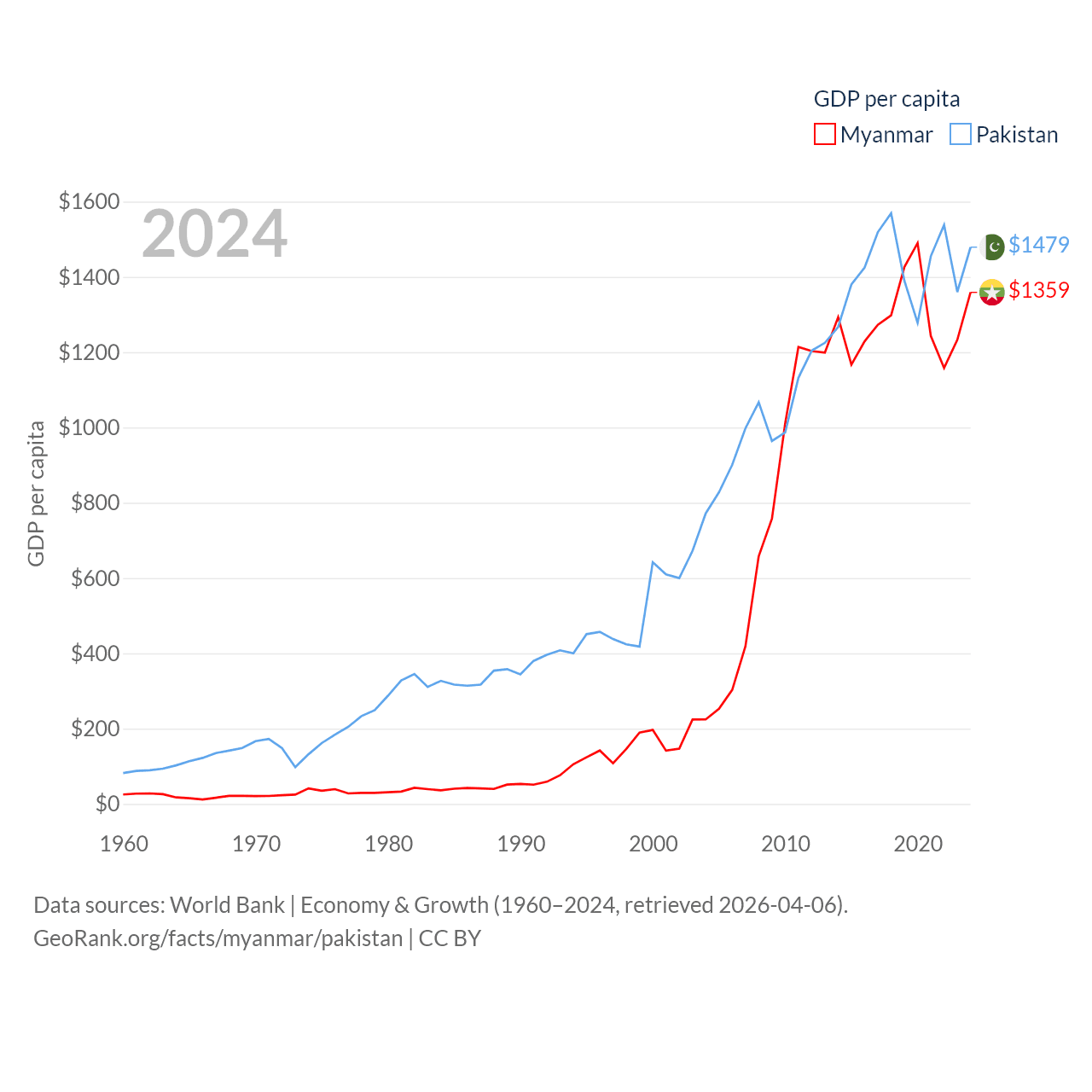 By GDP, Myanmar ranks 85/197 ($74.1B) and Pakistan ranks 43/197 ($372B). By GDP per capita, Myanmar ranks 165/197 ($1,359), while Pakistan ranks 163/197 ($1,479).
