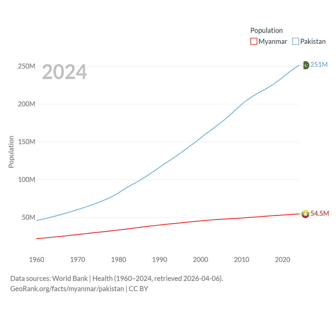 Myanmar has a population of 54.5M (ranked 27/197), compared with 251M in Pakistan (ranked 5/197). Myanmar's land area is 251,997 sq mi versus 297,638 sq mi for Pakistan (ranked 39th vs. 35th).