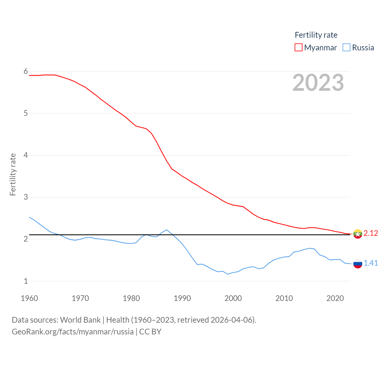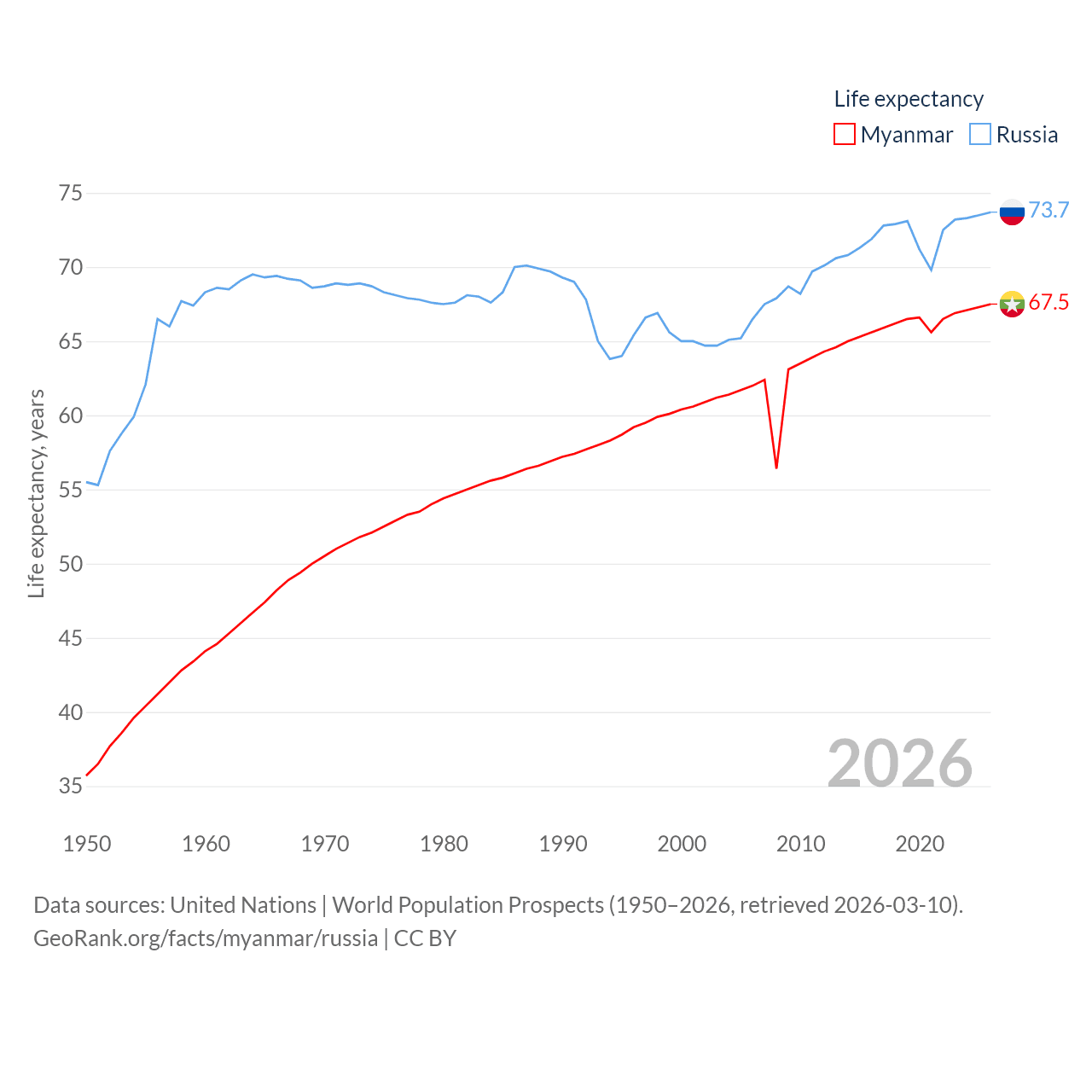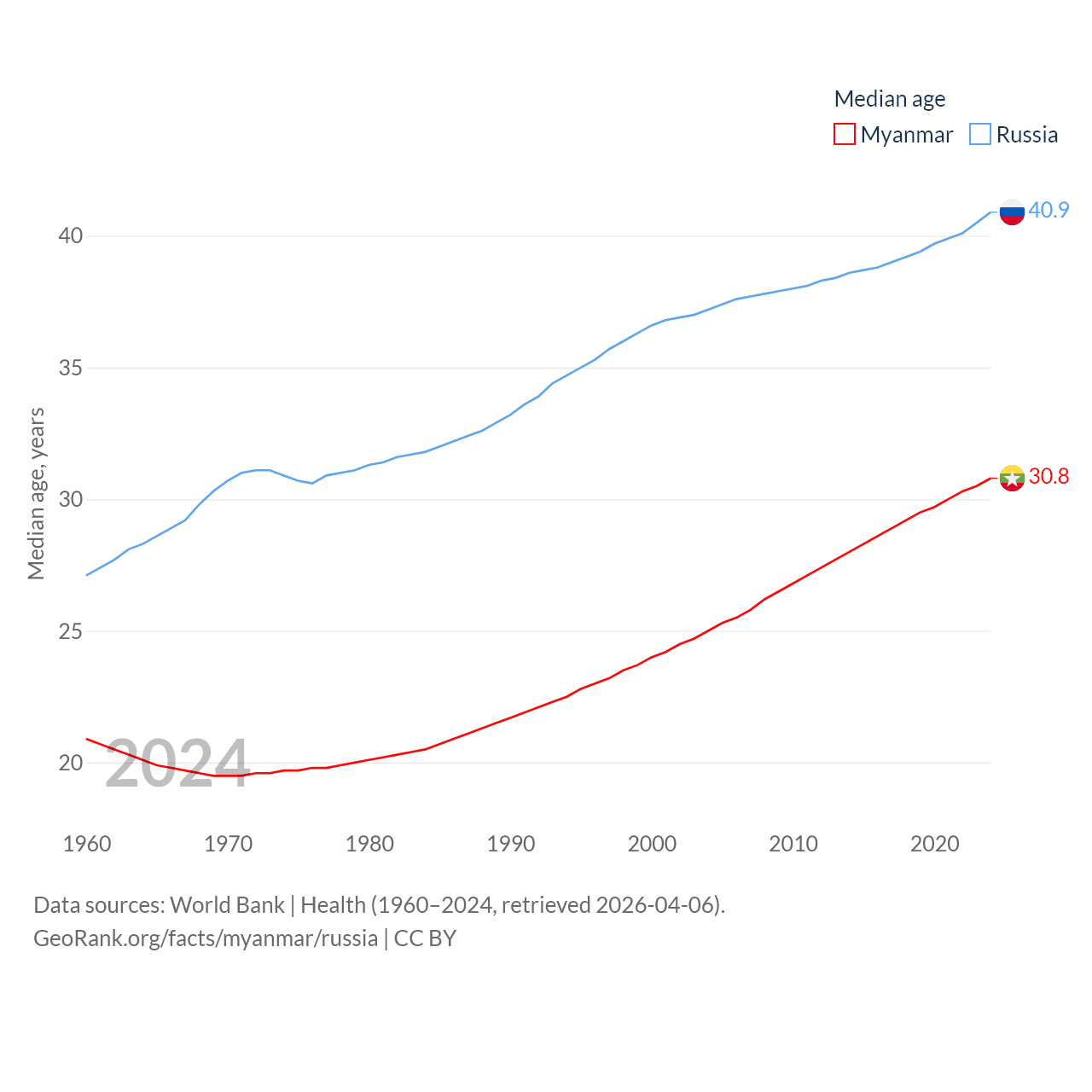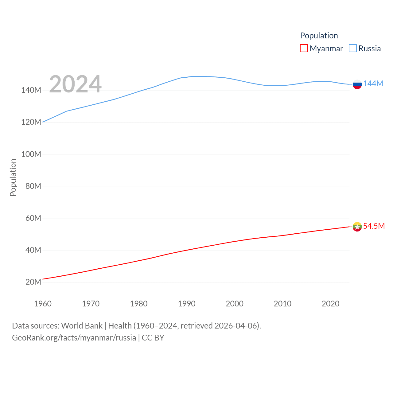Myanmar has a population of 54.5M (ranked 27/197), compared with 144M in Russia (ranked 9/197). Myanmar's land area is 251,997 sq mi versus 6,323,145 sq mi for Russia (ranked 39th vs. 1st).