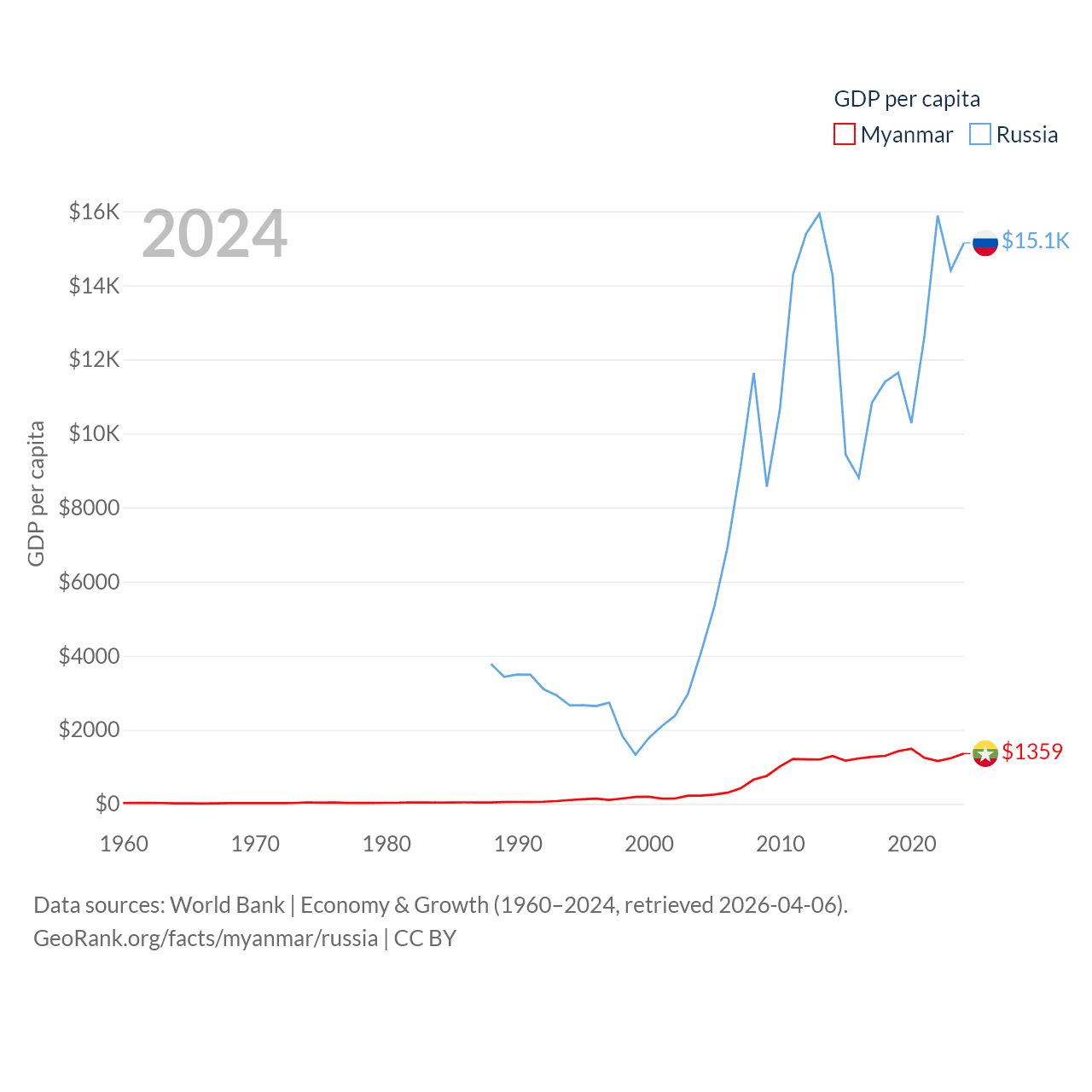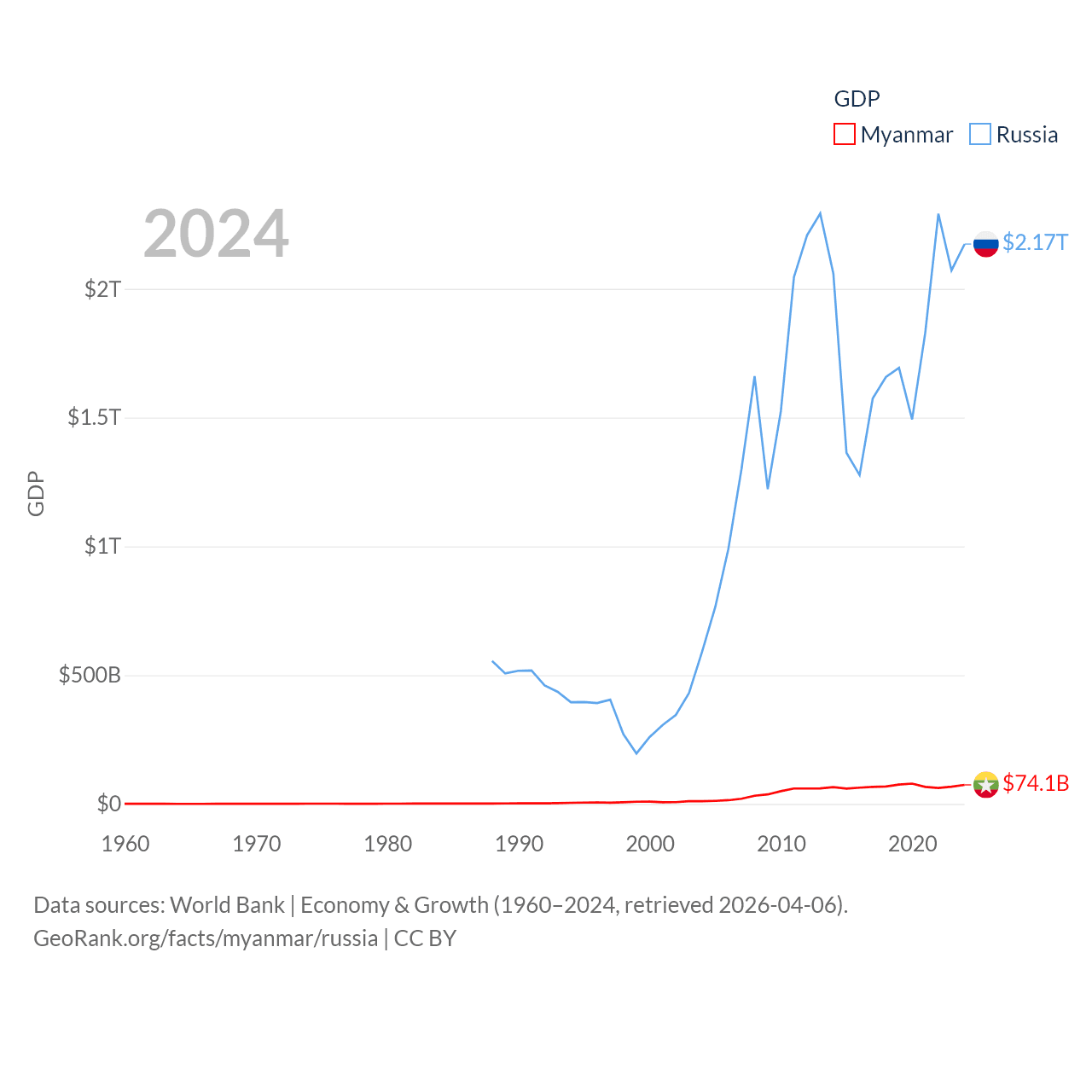 By GDP, Myanmar ranks 85/197 ($74.1B) and Russia ranks 11/197 ($2.17T). By GDP per capita, Myanmar ranks 165/197 ($1,359), while Russia ranks 68/197 ($15,145).