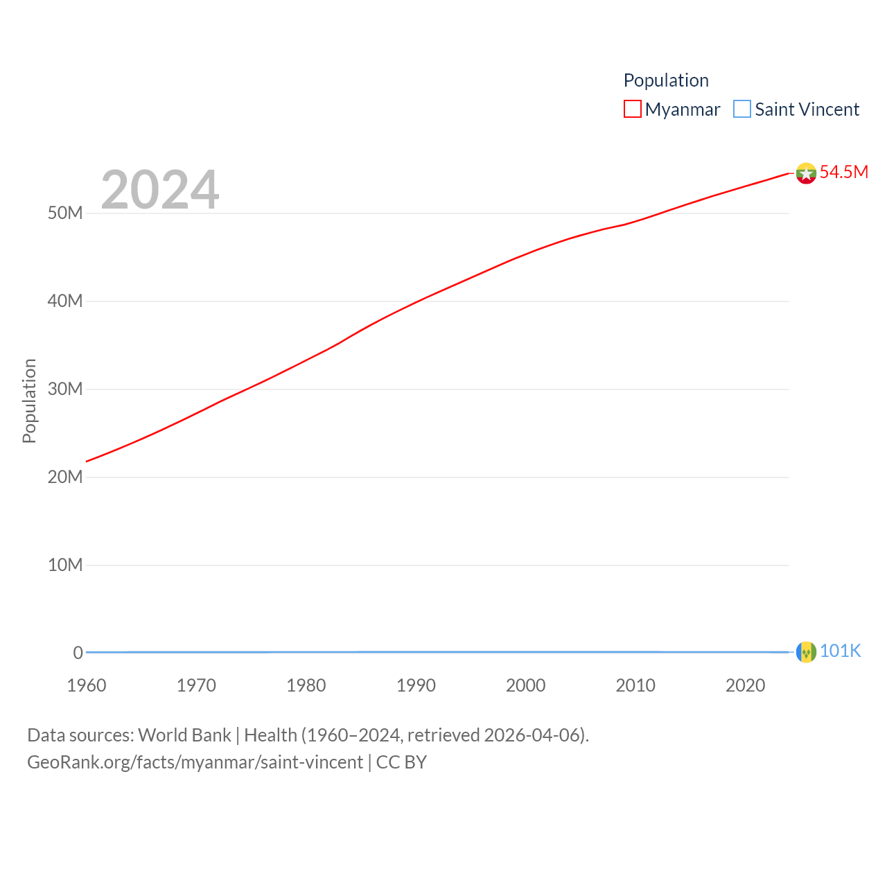 Myanmar has a population of 54.5M (ranked 27/197), compared with 101K in Saint Vincent (ranked 184/197). Myanmar's land area is 251,997 sq mi versus 150.6 sq mi for Saint Vincent (ranked 39th vs. 185th).