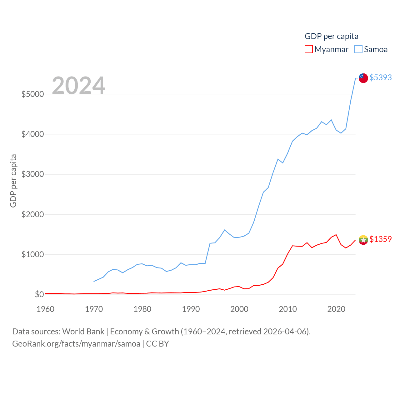 By GDP, Myanmar ranks 85/197 ($74.1B) and Samoa ranks 185/197 ($1.18B). By GDP per capita, Myanmar ranks 165/197 ($1,359), while Samoa ranks 117/197 ($5,393).
