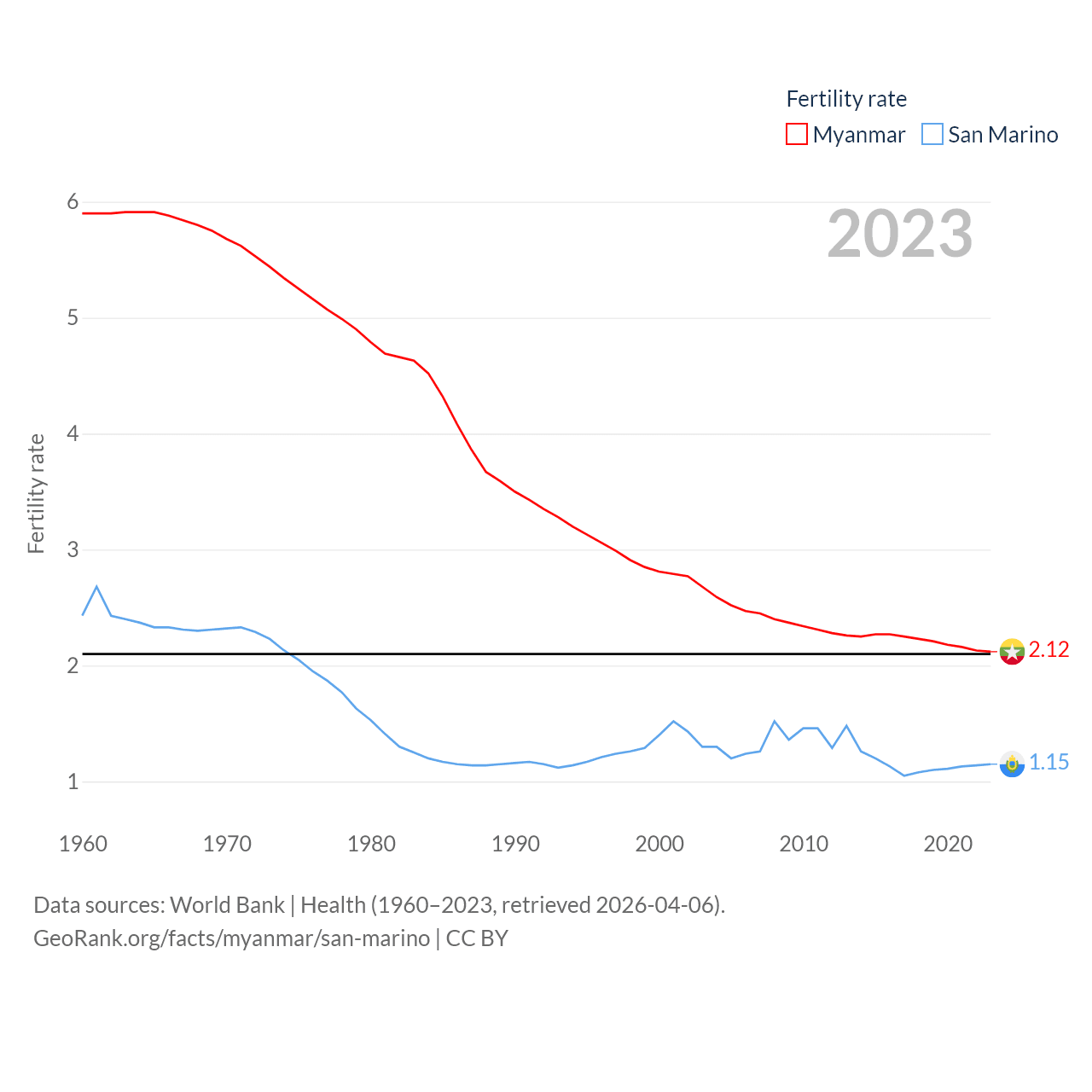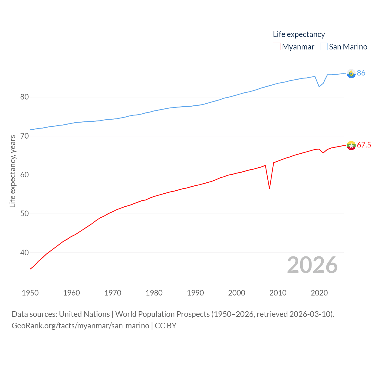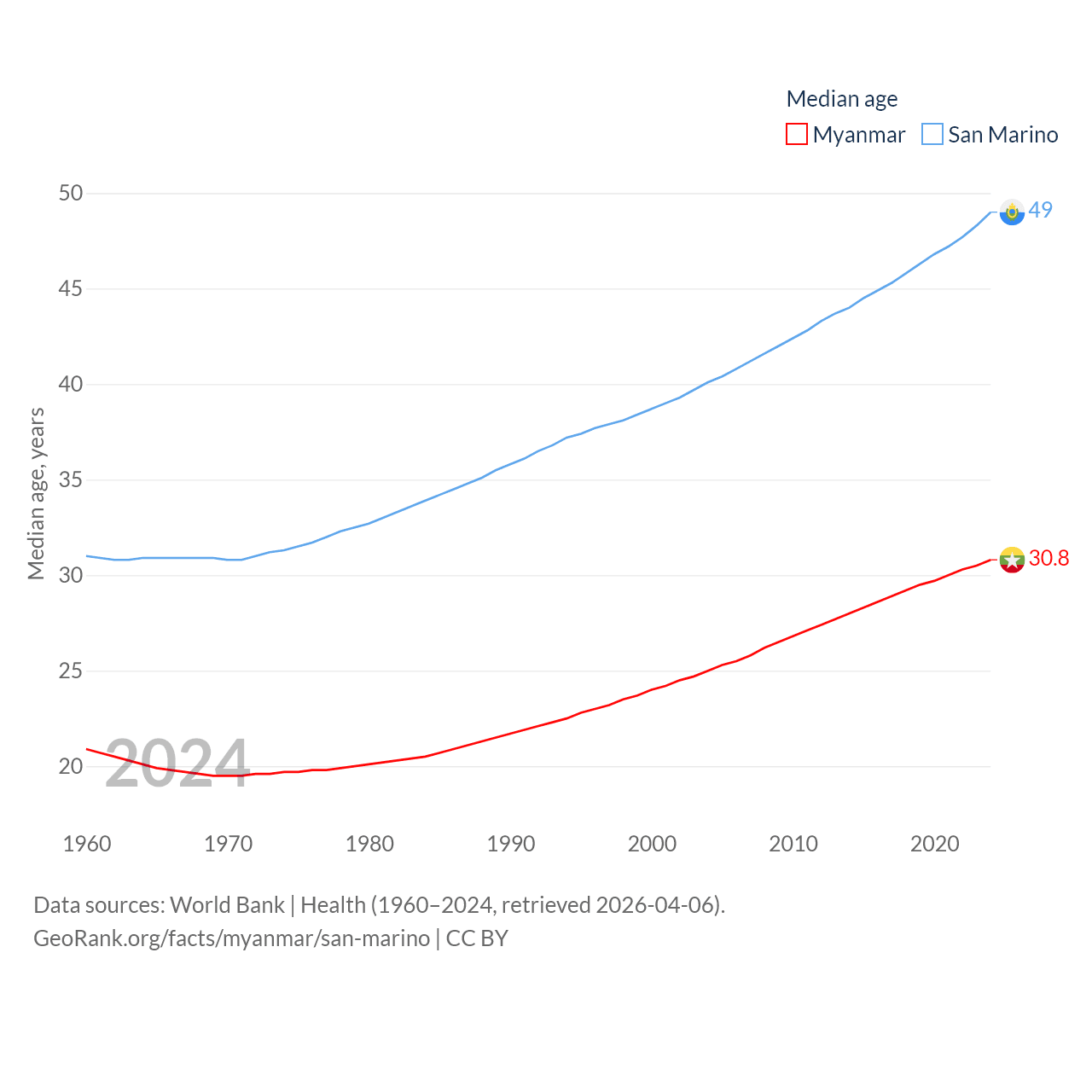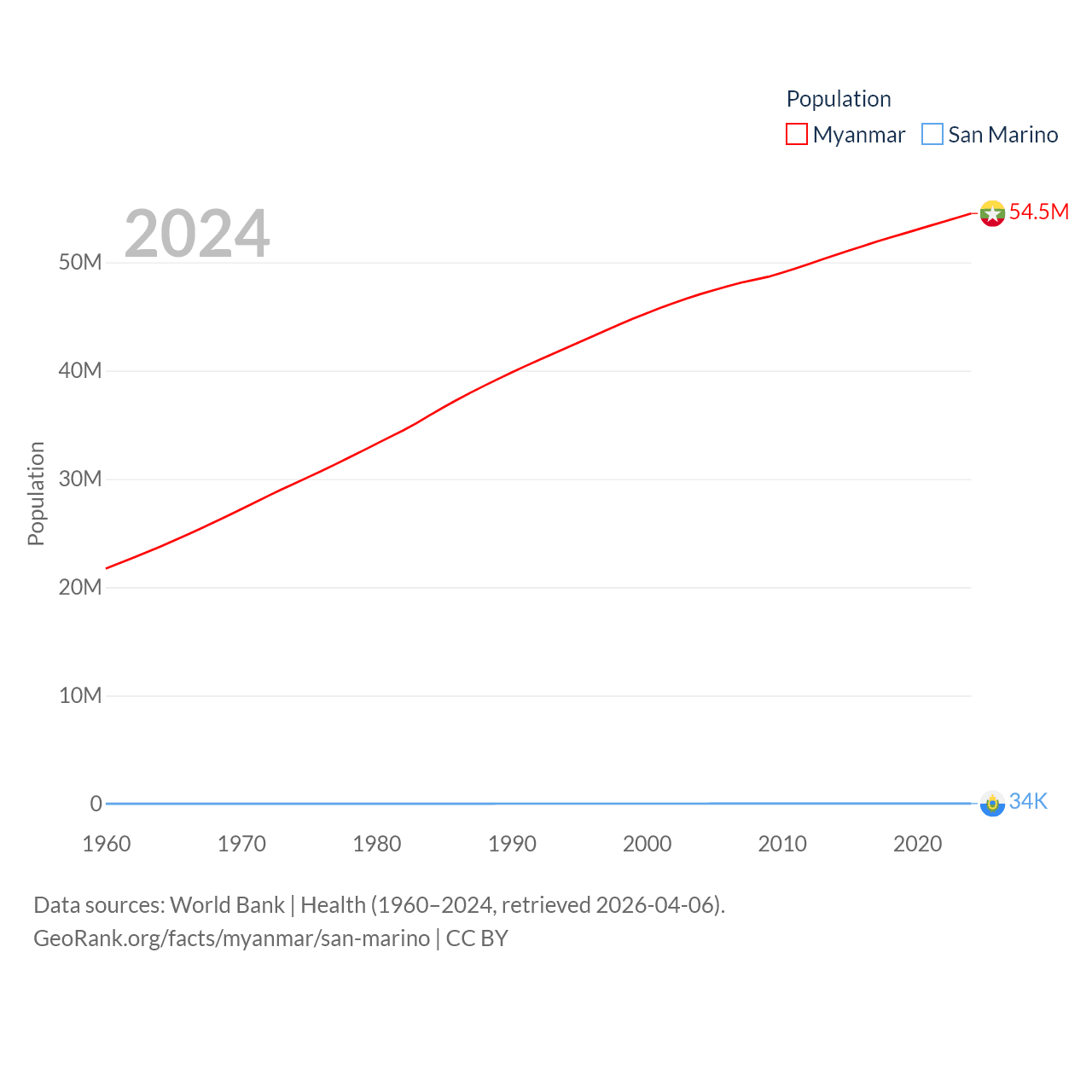 Myanmar has a population of 54.5M (ranked 27/197), compared with 34K in San Marino (ranked 193/197). Myanmar's land area is 251,997 sq mi versus 23.2 sq mi for San Marino (ranked 39th vs. 193rd).