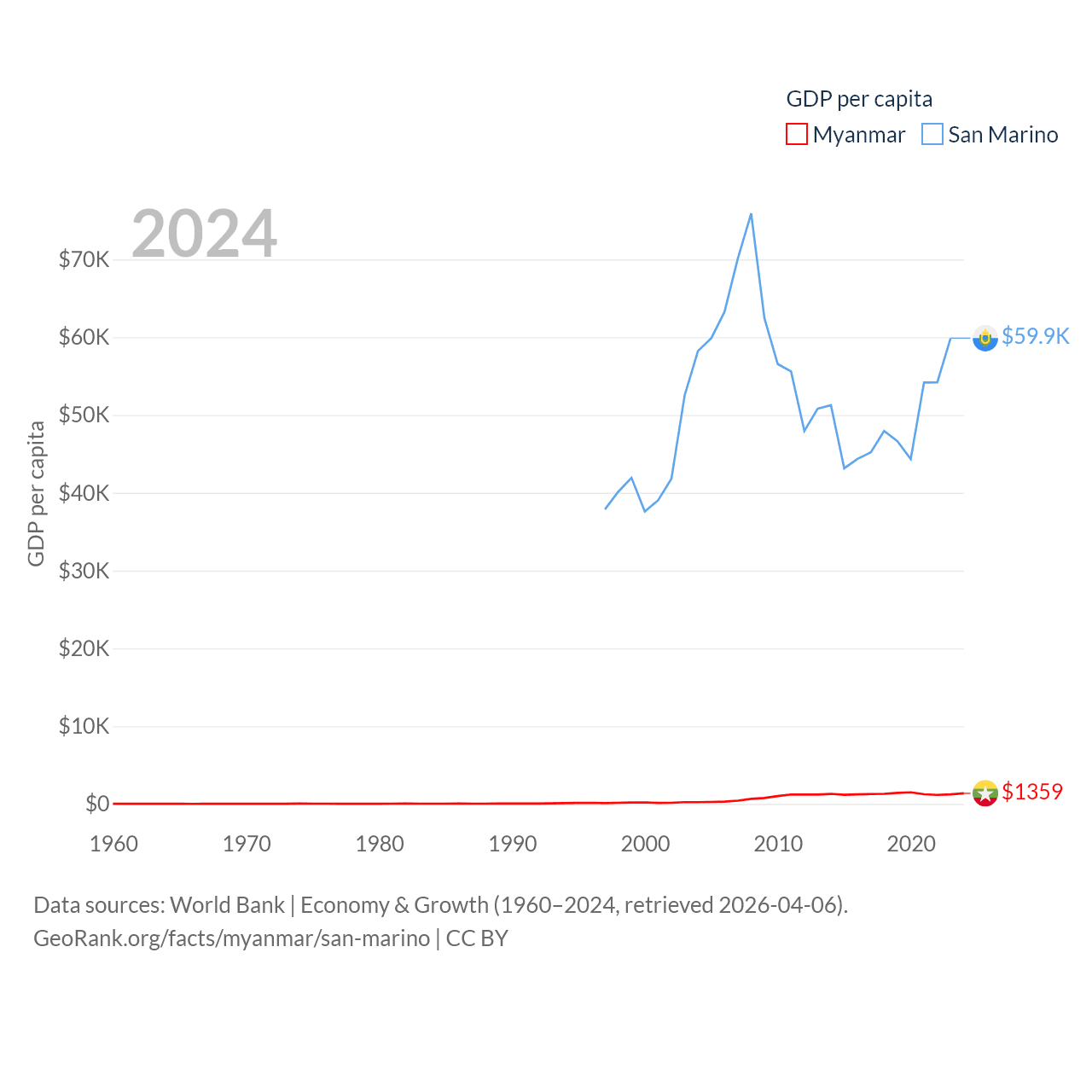 By GDP, Myanmar ranks 85/197 ($74.1B) and San Marino ranks 180/197 ($2.03B). By GDP per capita, Myanmar ranks 165/197 ($1,359), while San Marino ranks 15/197 ($59,880).
