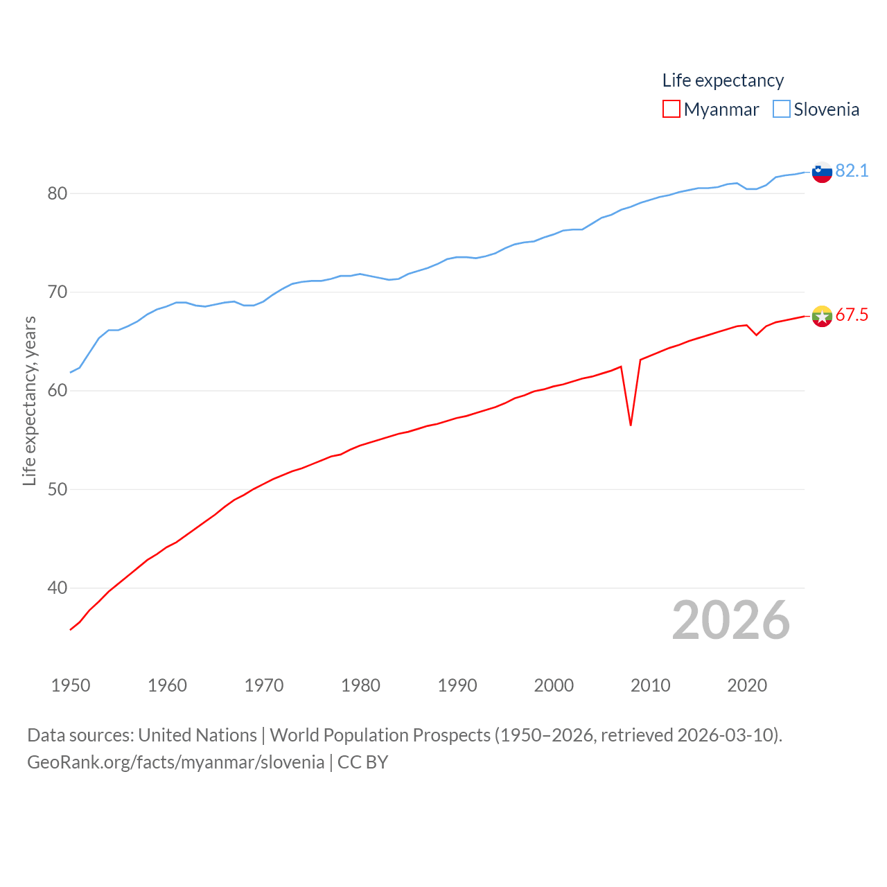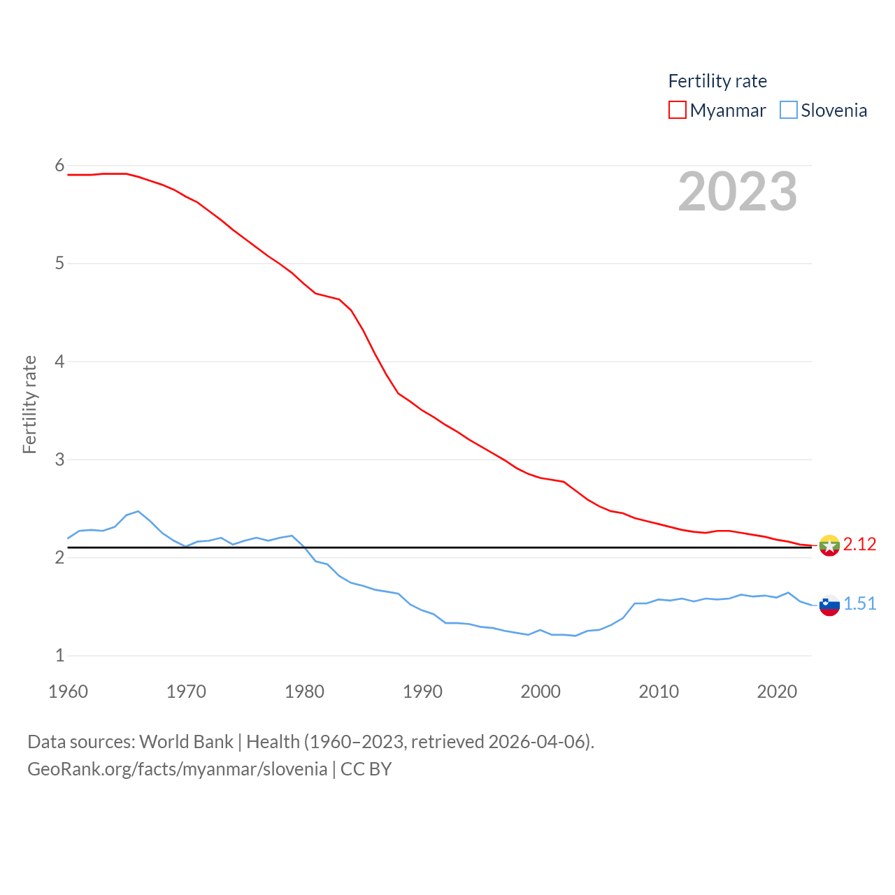 Myanmar has a population of 54.5M (ranked 27/197), compared with 2.13M in Slovenia (ranked 147/197). Myanmar's land area is 251,997 sq mi versus 7,774 sq mi for Slovenia (ranked 39th vs. 151st).