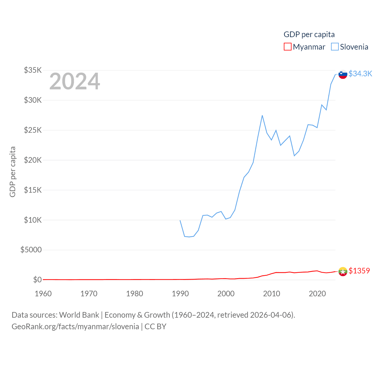 By GDP, Myanmar ranks 85/197 ($74.1B) and Slovenia ranks 86/197 ($73B). By GDP per capita, Myanmar ranks 165/197 ($1,359), while Slovenia ranks 34/197 ($34,301).