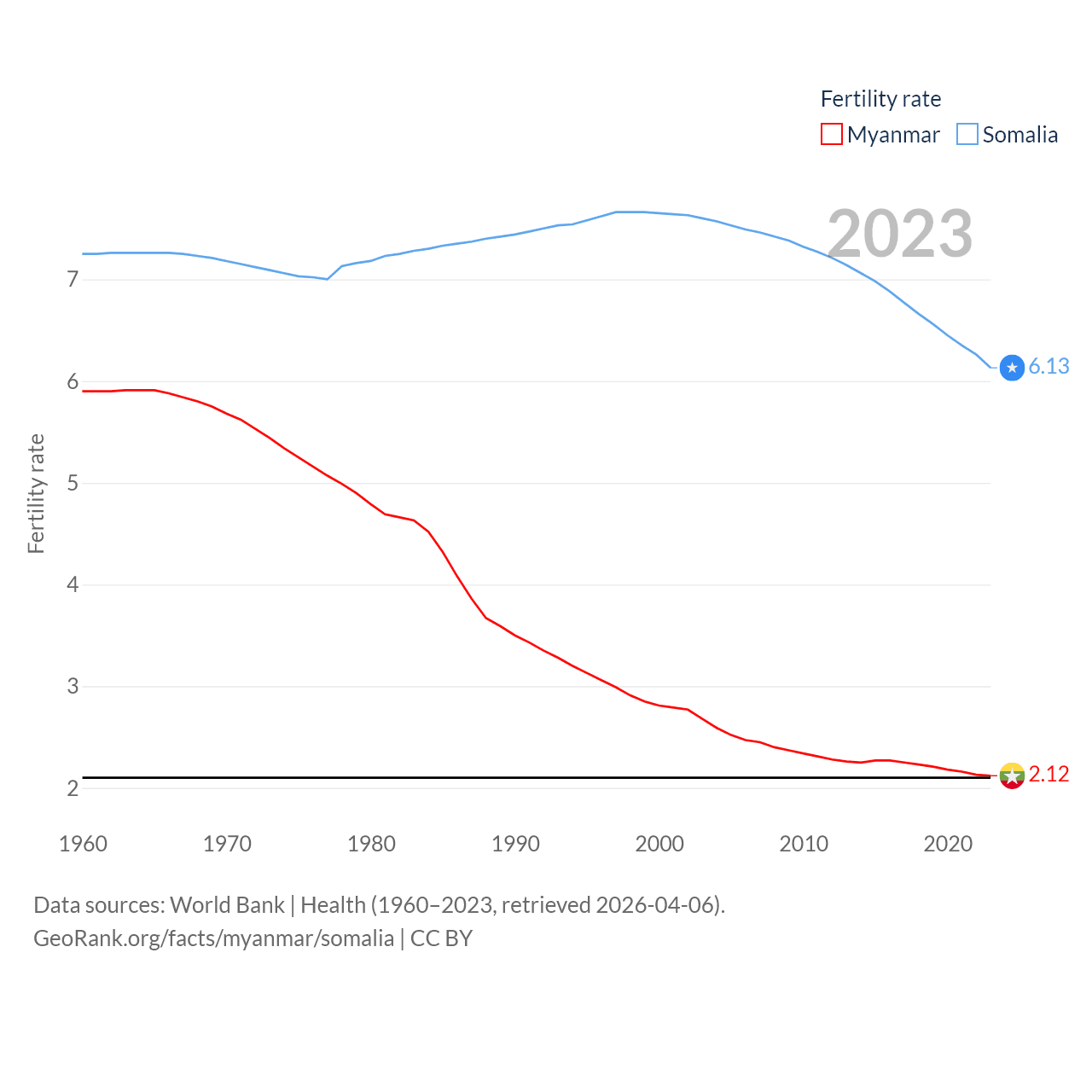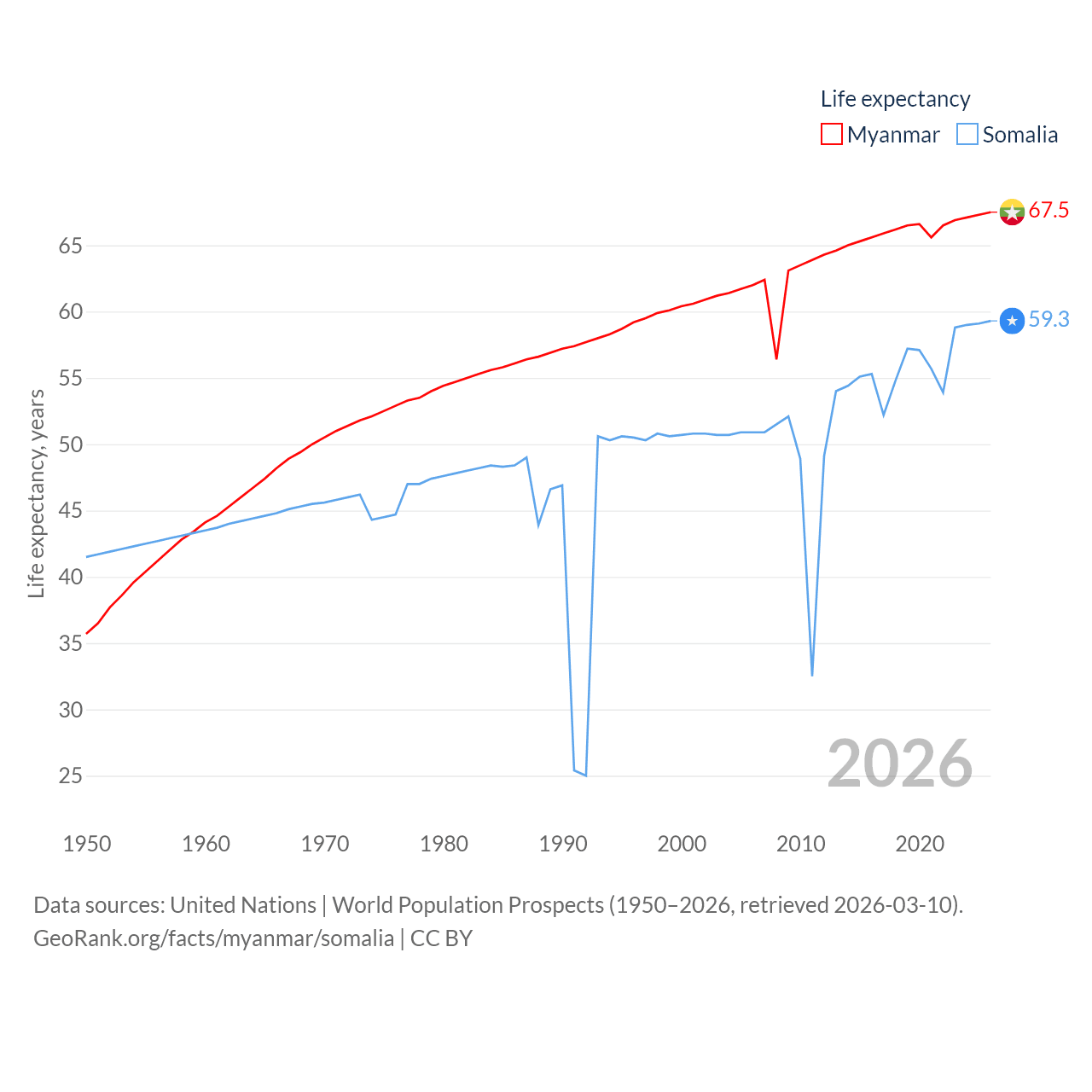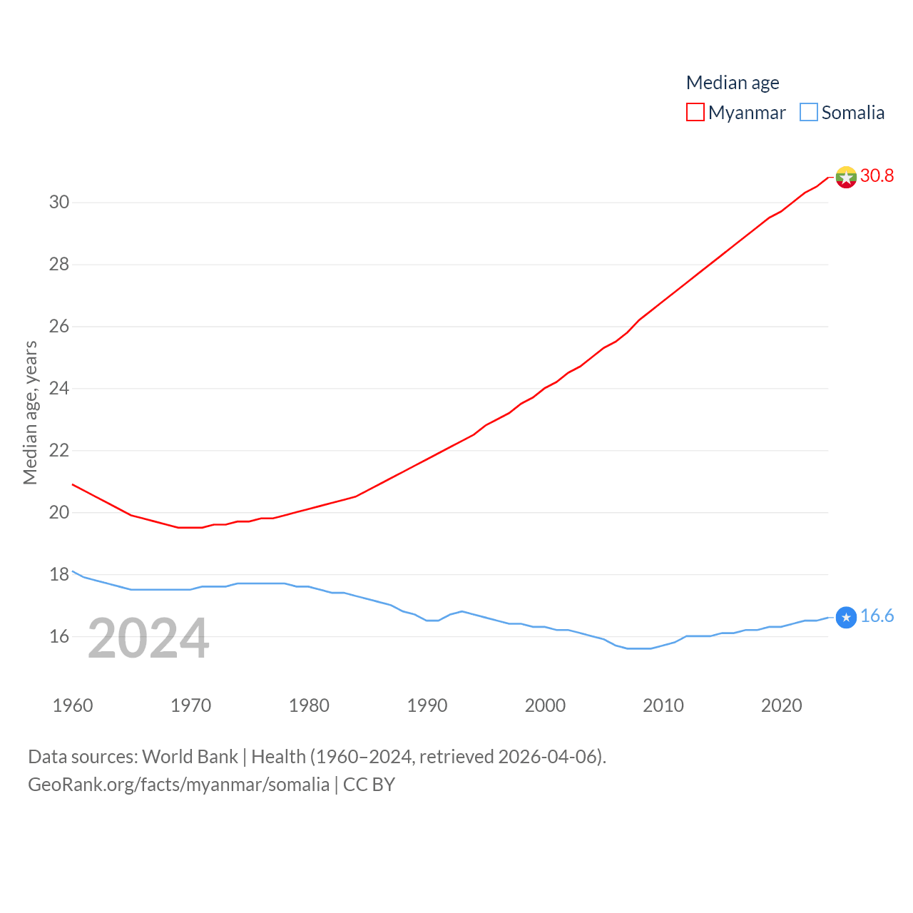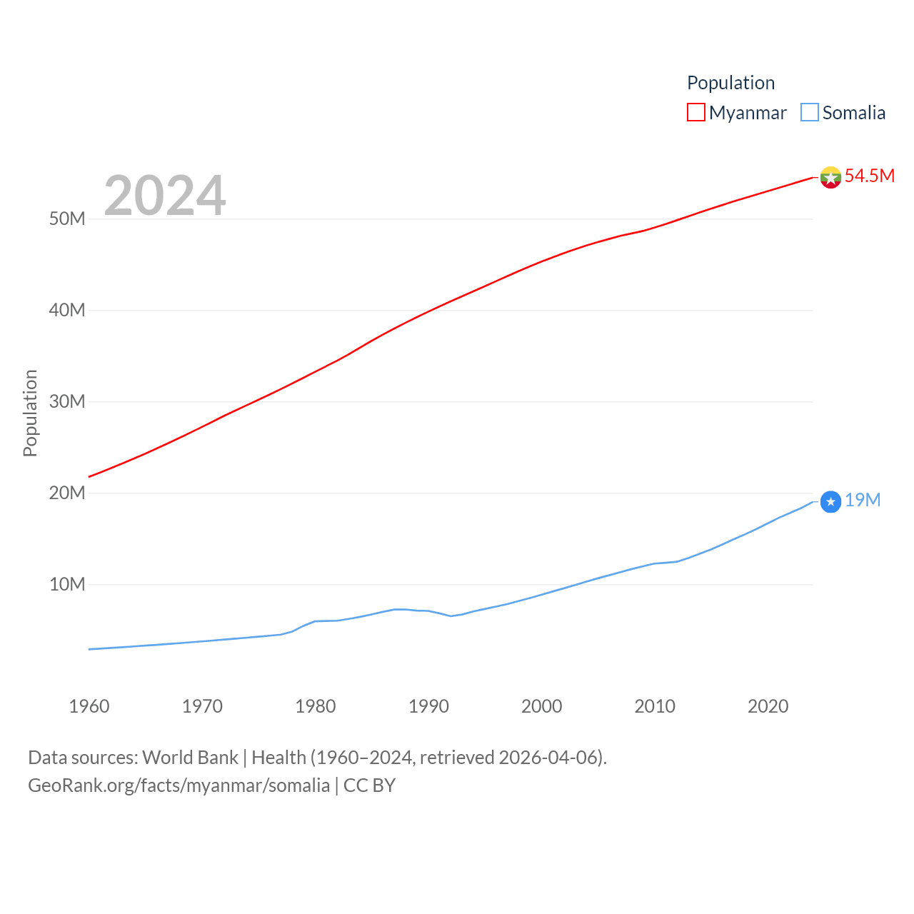 Myanmar has a population of 54.5M (ranked 27/197), compared with 19M in Somalia (ranked 68/197). Myanmar's land area is 251,997 sq mi versus 242,217 sq mi for Somalia (ranked 39th vs. 42nd).