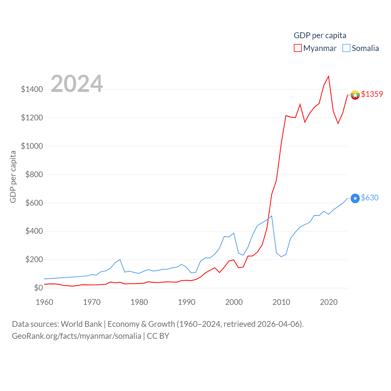 By GDP, Myanmar ranks 85/197 ($74.1B) and Somalia ranks 150/197 ($12B). By GDP per capita, Myanmar ranks 165/197 ($1,359), while Somalia ranks 192/197 ($630).