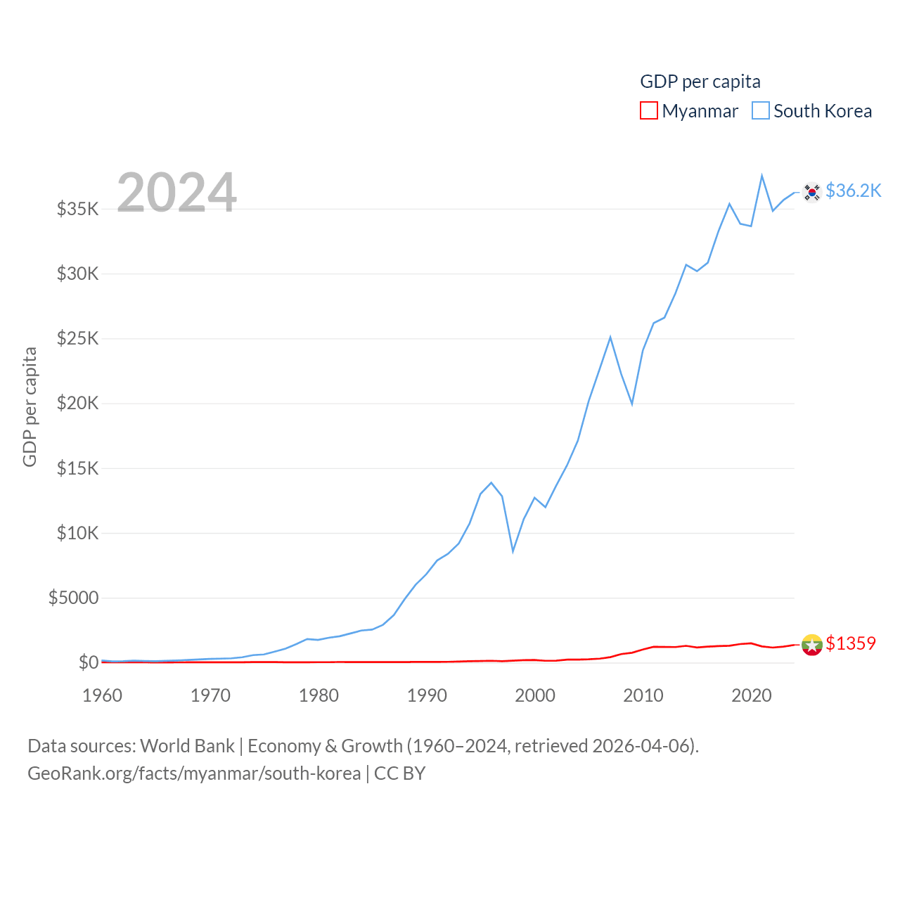 By GDP, Myanmar ranks 85/197 ($74.1B) and South Korea ranks 12/197 ($1.88T). By GDP per capita, Myanmar ranks 165/197 ($1,359), while South Korea ranks 31/197 ($36,239).