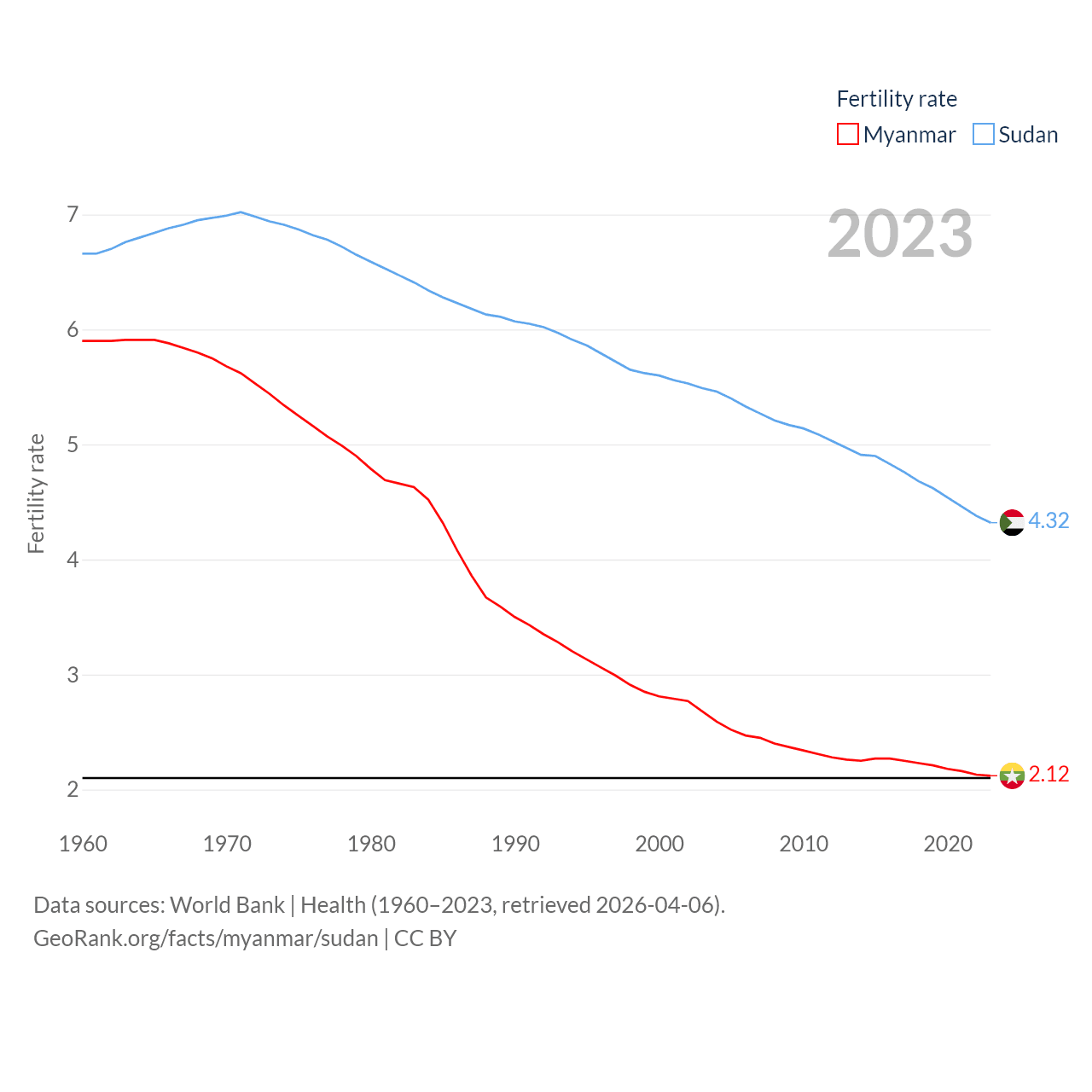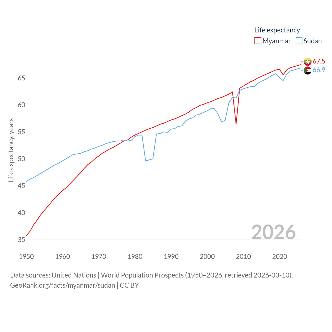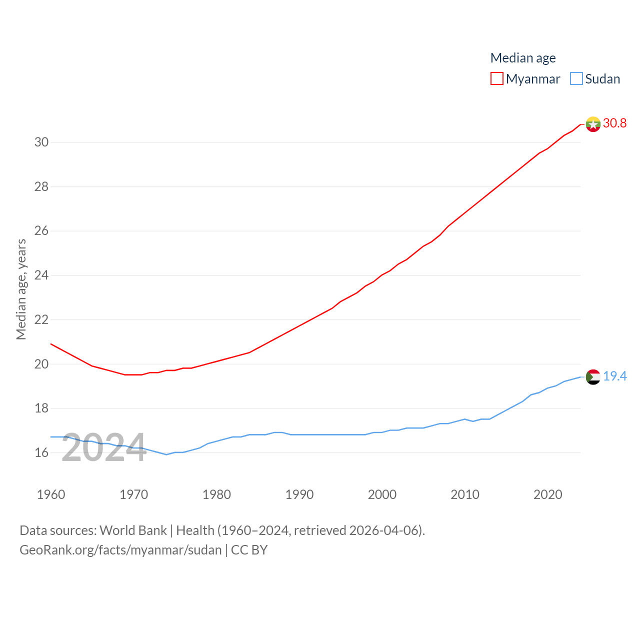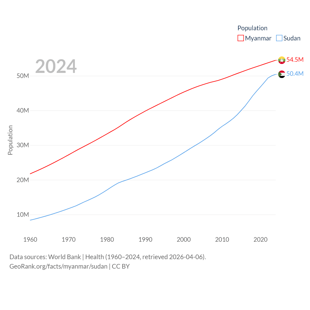 Myanmar has a population of 54.5M (ranked 27/197), compared with 50.4M in Sudan (ranked 30/197). Myanmar's land area is 251,997 sq mi versus 721,239 sq mi for Sudan (ranked 39th vs. 15th).
