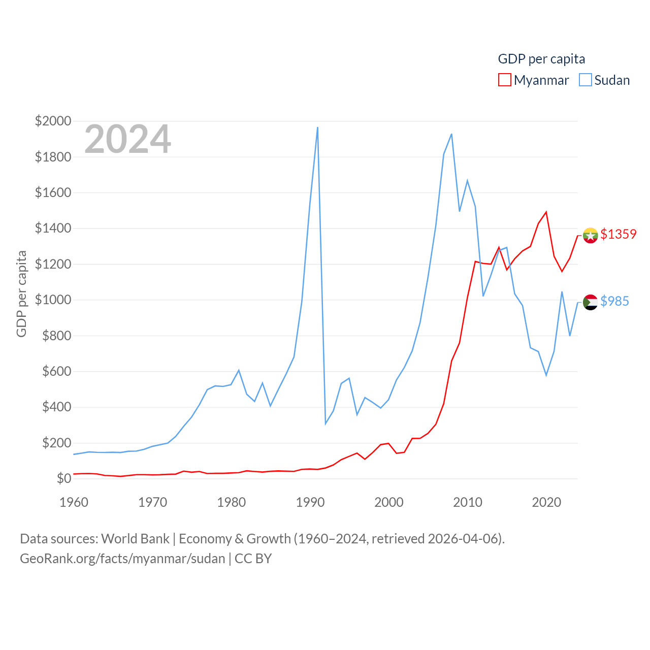 By GDP, Myanmar ranks 85/197 ($74.1B) and Sudan ranks 94/197 ($49.7B). By GDP per capita, Myanmar ranks 165/197 ($1,359), while Sudan ranks 179/197 ($985).