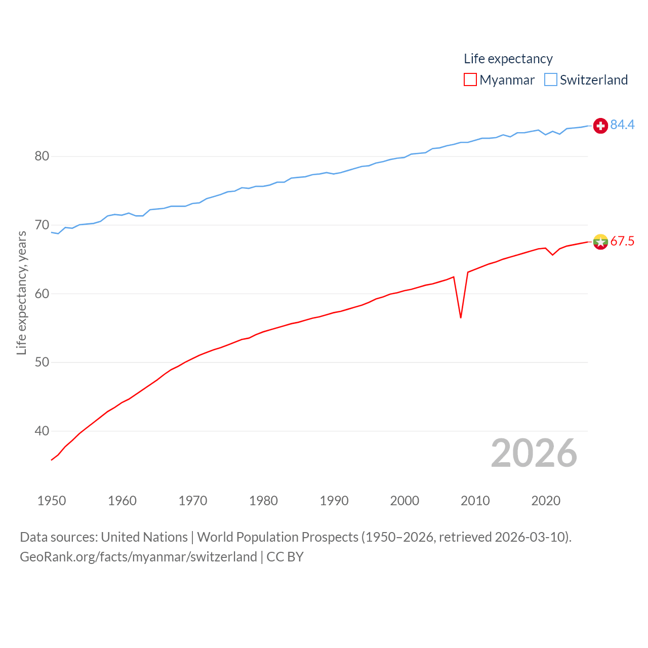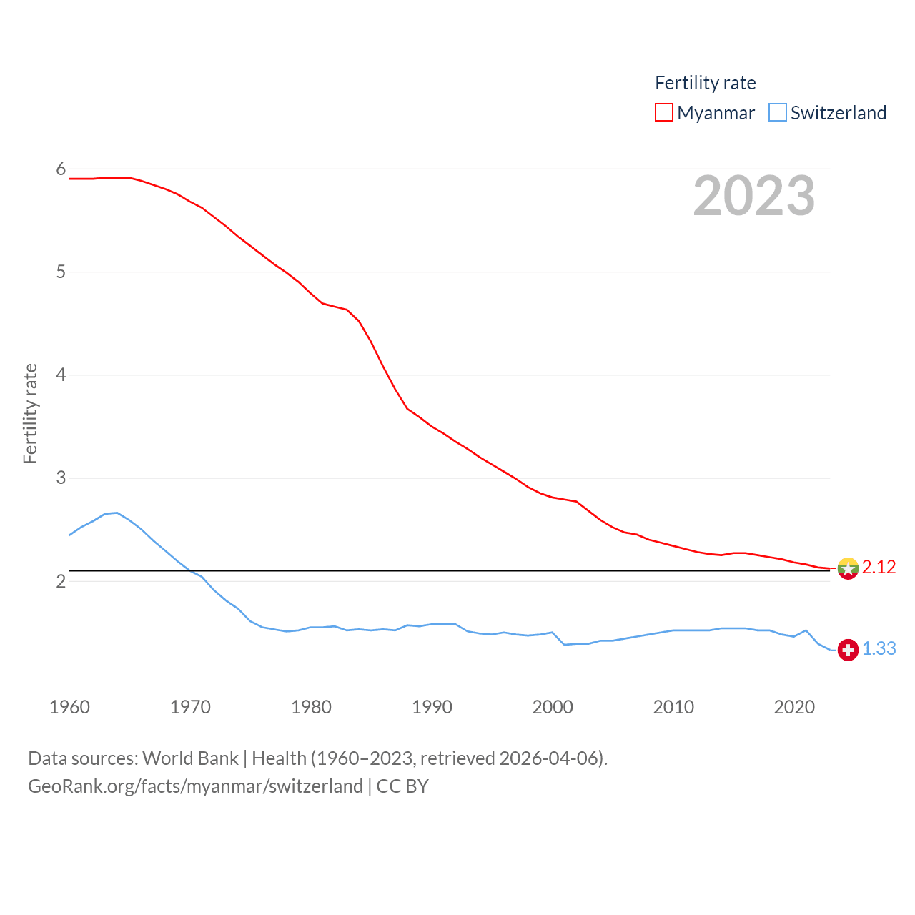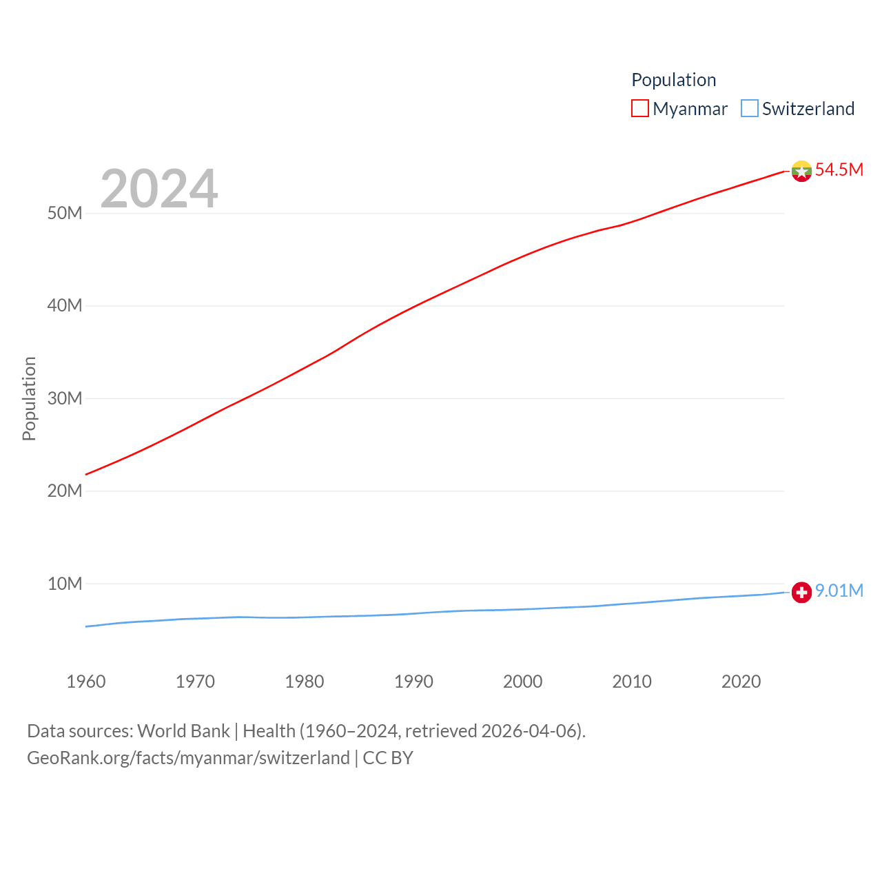 Myanmar has a population of 54.5M (ranked 27/197), compared with 9.01M in Switzerland (ranked 101/197). Myanmar's land area is 251,997 sq mi versus 15,255 sq mi for Switzerland (ranked 39th vs. 131st).