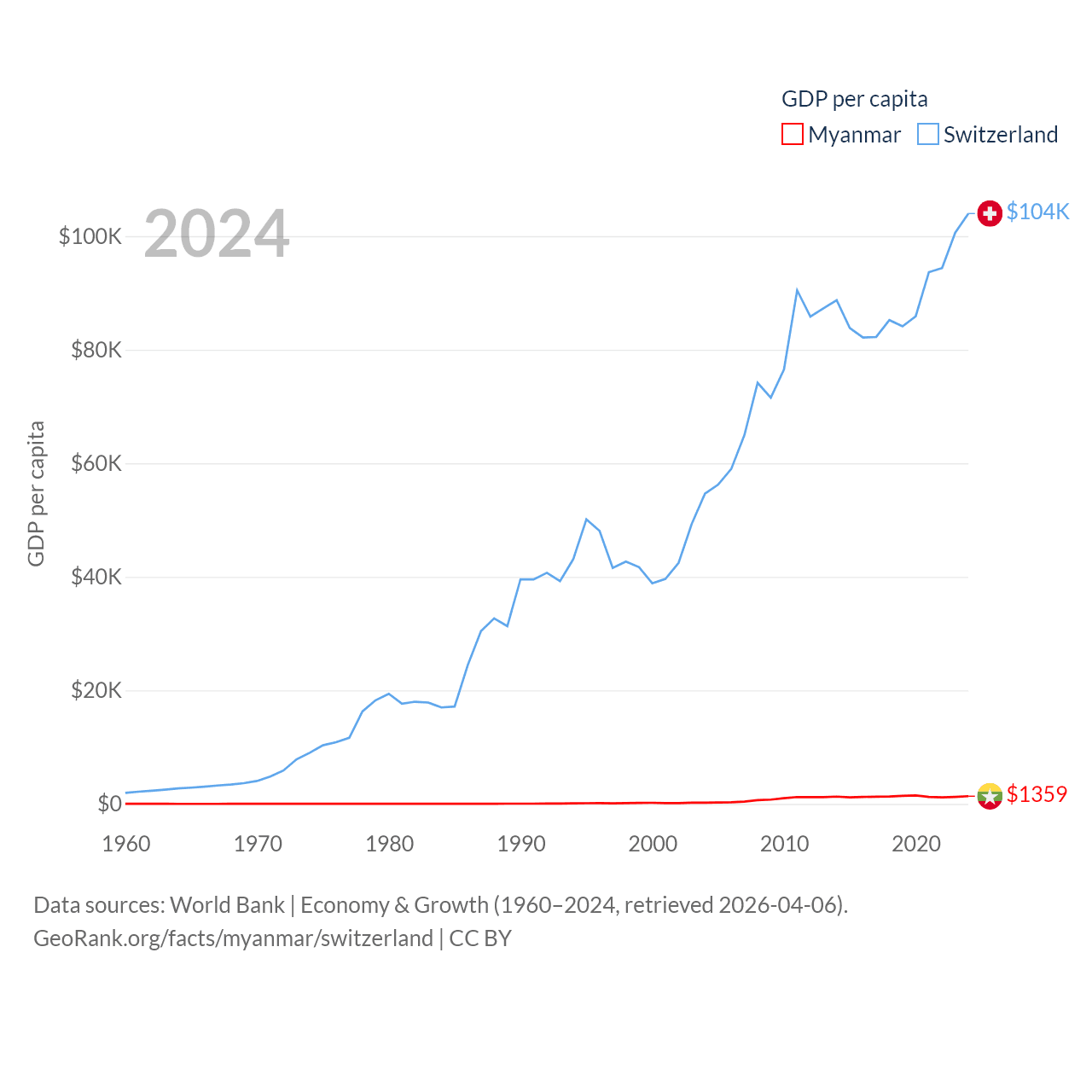 By GDP, Myanmar ranks 85/197 ($74.1B) and Switzerland ranks 20/197 ($937B). By GDP per capita, Myanmar ranks 165/197 ($1,359), while Switzerland ranks 5/197 ($103,998).