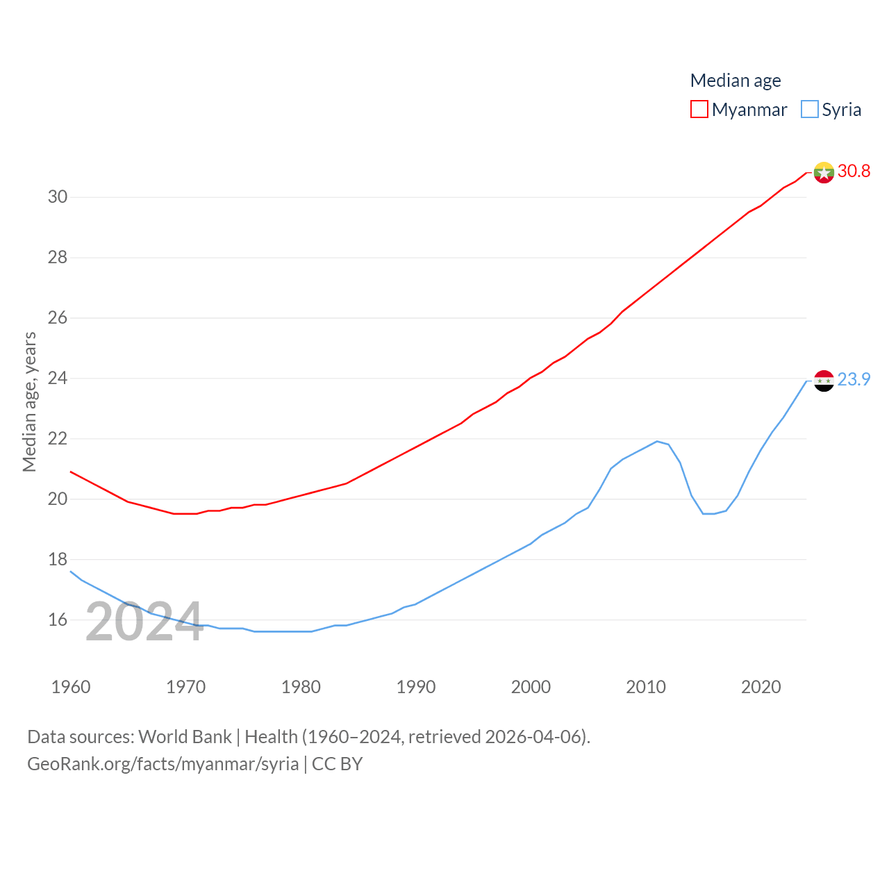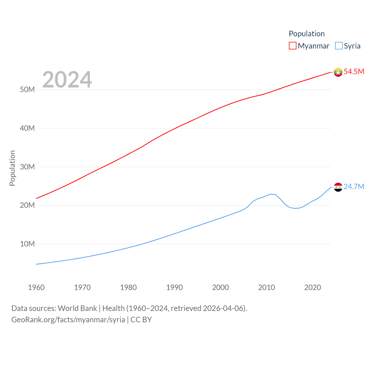 Myanmar has a population of 54.5M (ranked 27/197), compared with 24.7M in Syria (ranked 57/197). Myanmar's land area is 251,997 sq mi versus 70,900 sq mi for Syria (ranked 39th vs. 87th).