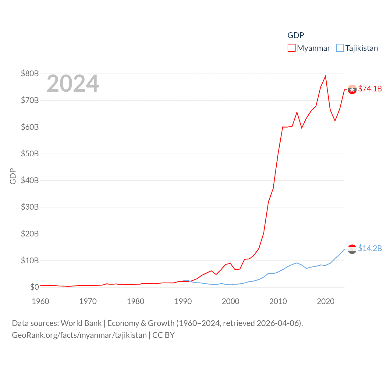 By GDP, Myanmar ranks 85/197 ($74.1B) and Tajikistan ranks 145/197 ($14.2B). By GDP per capita, Myanmar ranks 165/197 ($1,359), while Tajikistan ranks 166/197 ($1,341).