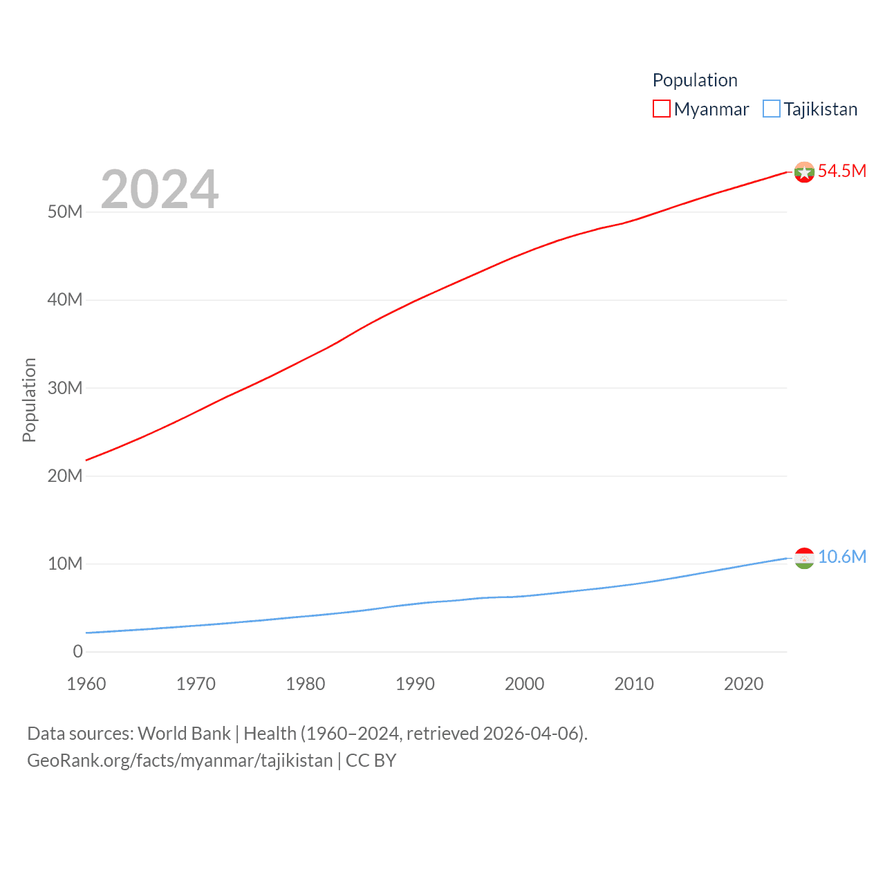 Myanmar has a population of 54.5M (ranked 27/197), compared with 10.6M in Tajikistan (ranked 91/197). Myanmar's land area is 251,997 sq mi versus 53,587 sq mi for Tajikistan (ranked 39th vs. 93rd).