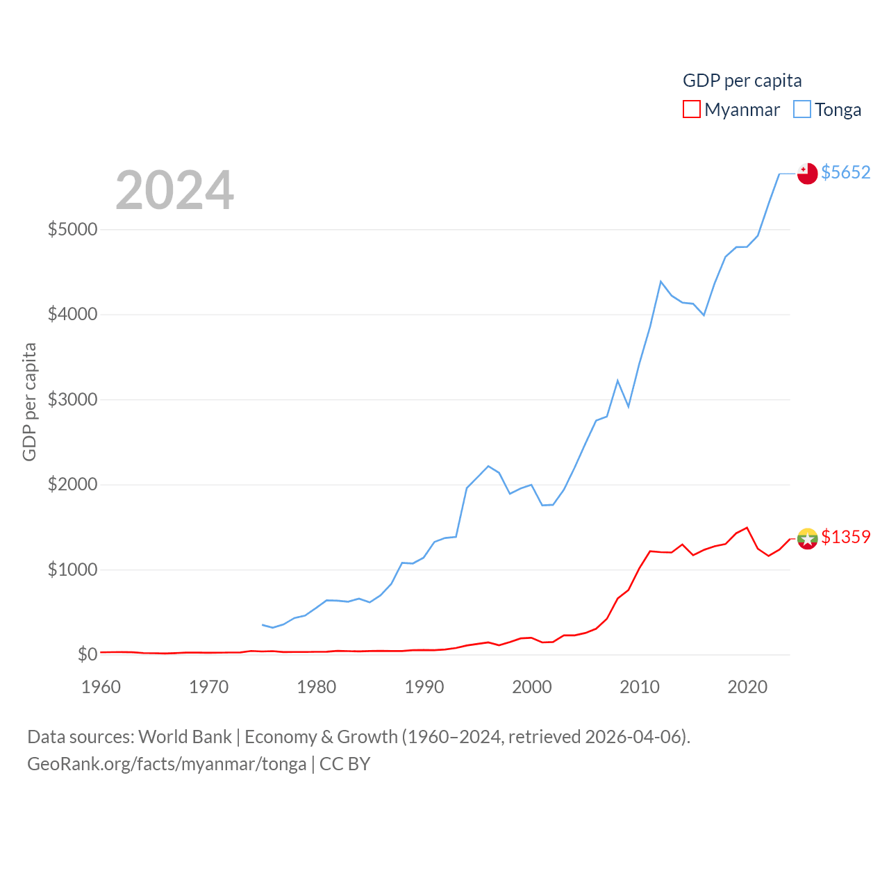 By GDP, Myanmar ranks 85/197 ($74.1B) and Tonga ranks 191/197 ($591M). By GDP per capita, Myanmar ranks 165/197 ($1,359), while Tonga ranks 115/197 ($5,652).