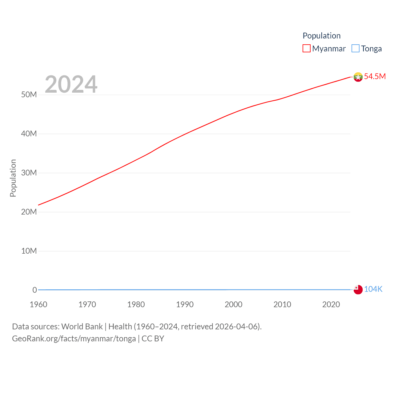Myanmar has a population of 54.5M (ranked 27/197), compared with 104K in Tonga (ranked 183/197). Myanmar's land area is 251,997 sq mi versus 278 sq mi for Tonga (ranked 39th vs. 176th).