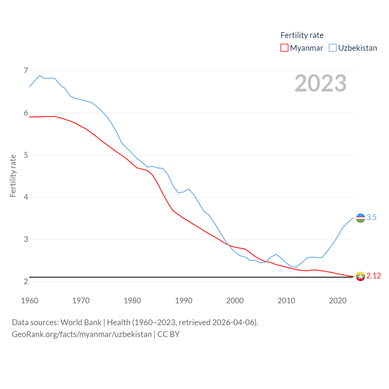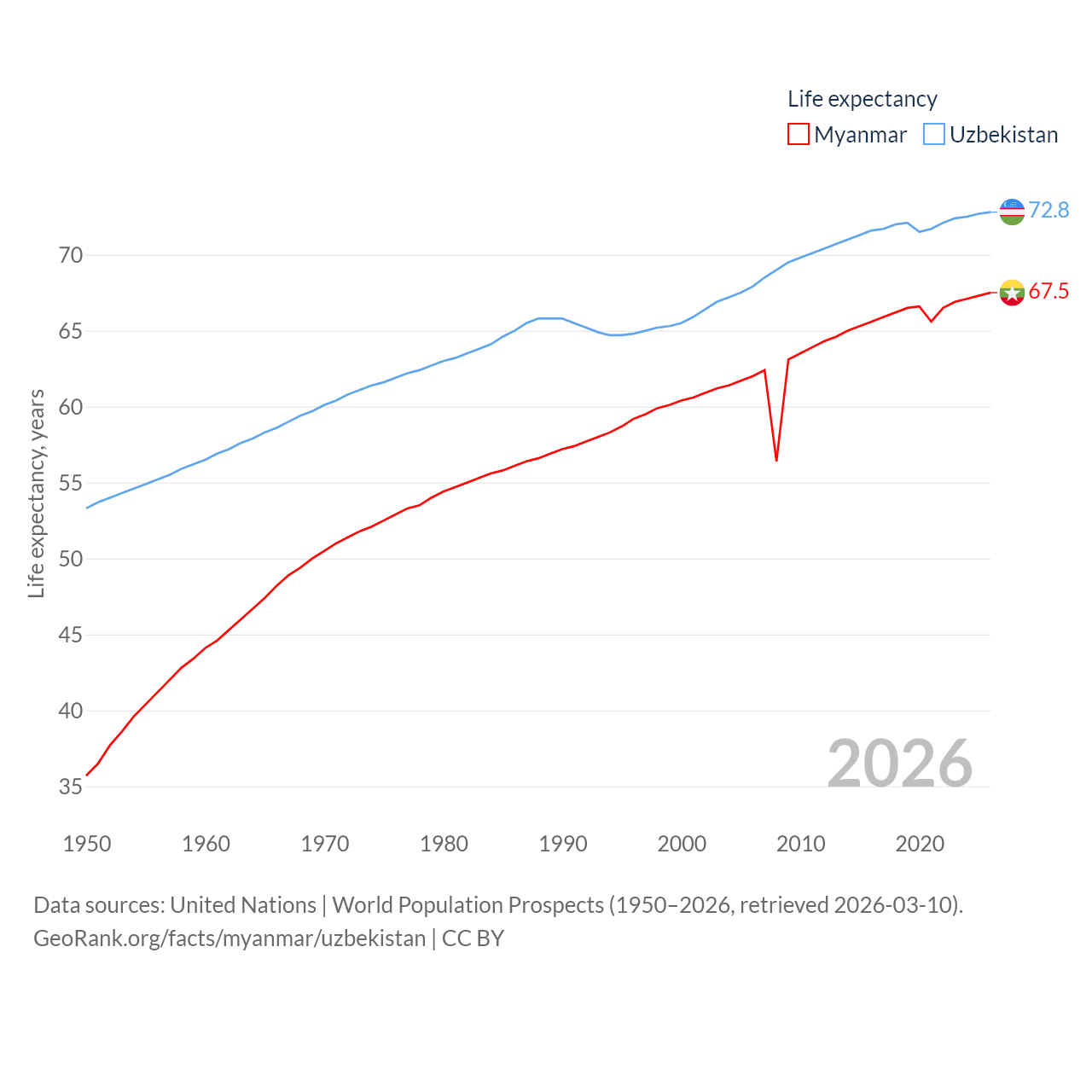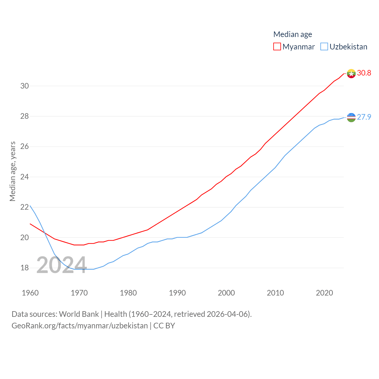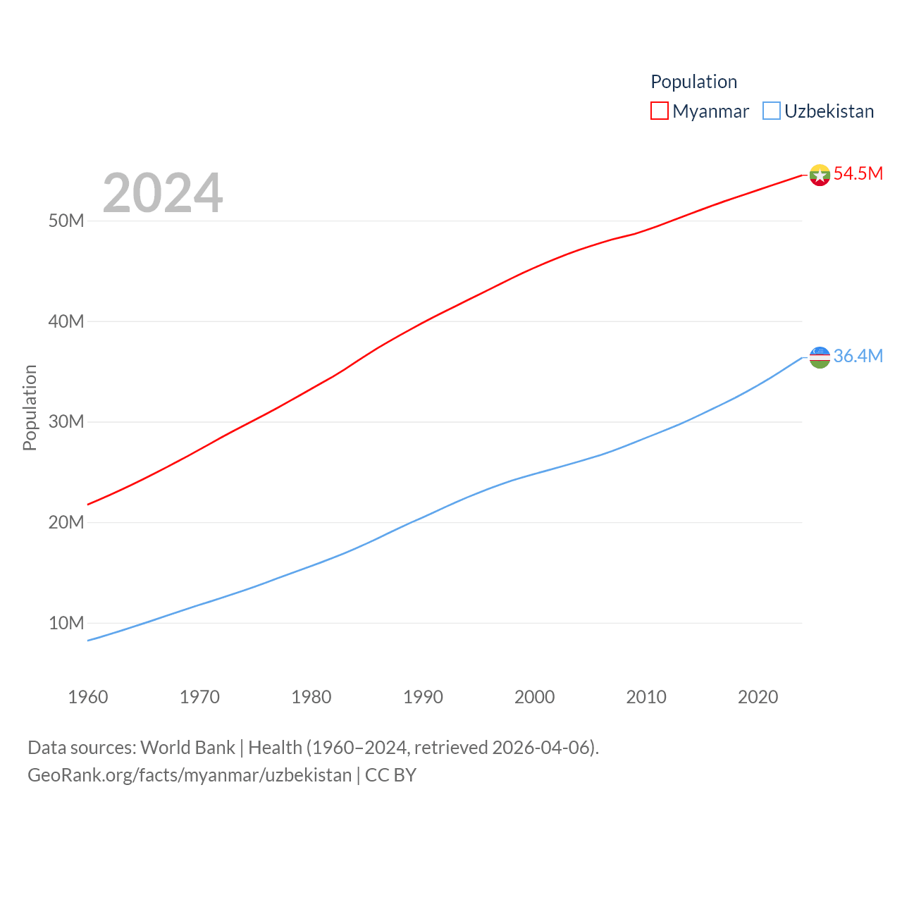 Myanmar has a population of 54.5M (ranked 27/197), compared with 36.4M in Uzbekistan (ranked 43/197). Myanmar's land area is 251,997 sq mi versus 170,136 sq mi for Uzbekistan (ranked 39th vs. 56th).
