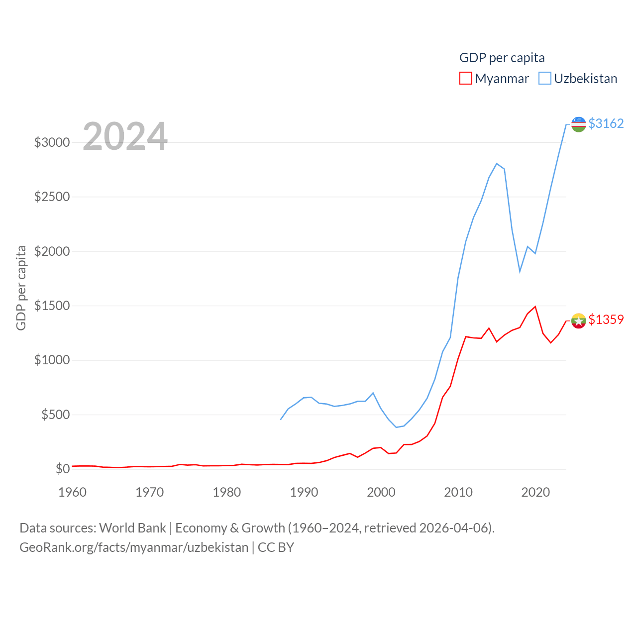 By GDP, Myanmar ranks 85/197 ($74.1B) and Uzbekistan ranks 66/197 ($115B). By GDP per capita, Myanmar ranks 165/197 ($1,359), while Uzbekistan ranks 139/197 ($3,162).