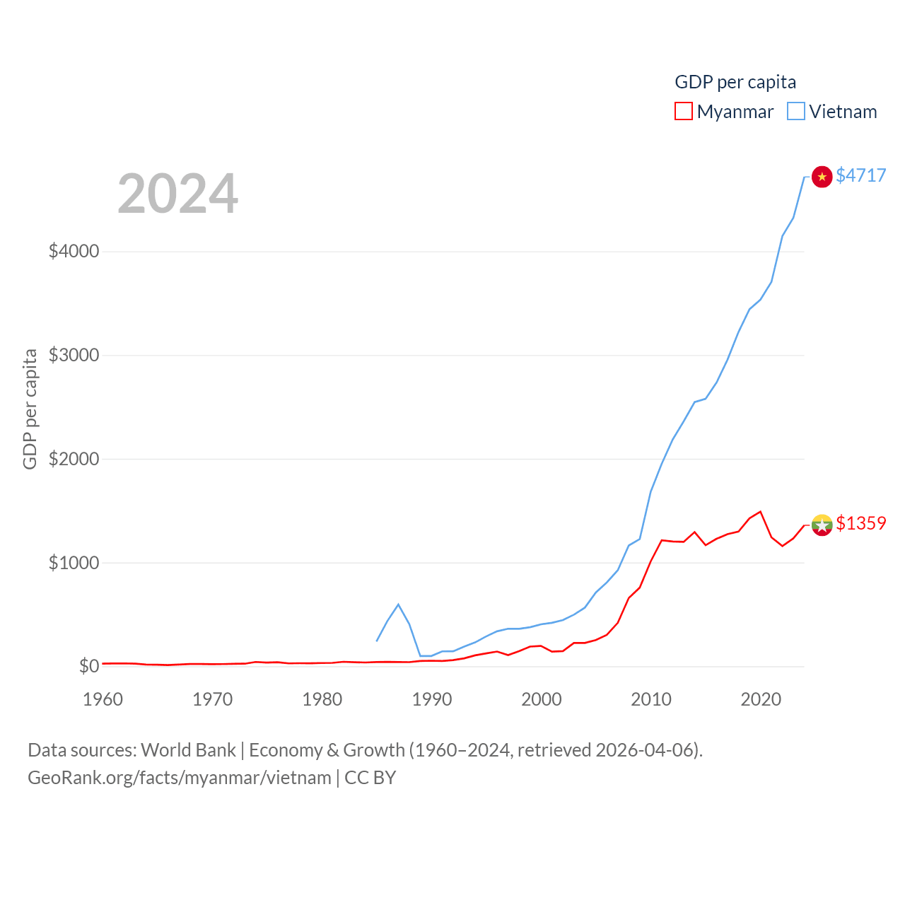 By GDP, Myanmar ranks 85/197 ($74.1B) and Vietnam ranks 33/197 ($476B). By GDP per capita, Myanmar ranks 165/197 ($1,359), while Vietnam ranks 122/197 ($4,717).