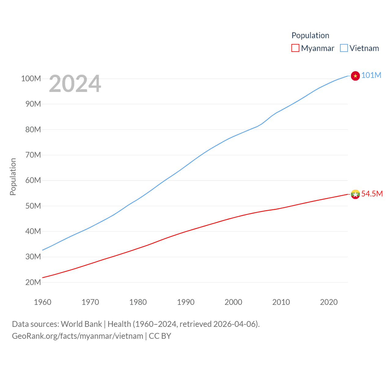Myanmar has a population of 54.5M (ranked 27/197), compared with 101M in Vietnam (ranked 16/197). Myanmar's land area is 251,997 sq mi versus 121,016 sq mi for Vietnam (ranked 39th vs. 67th).