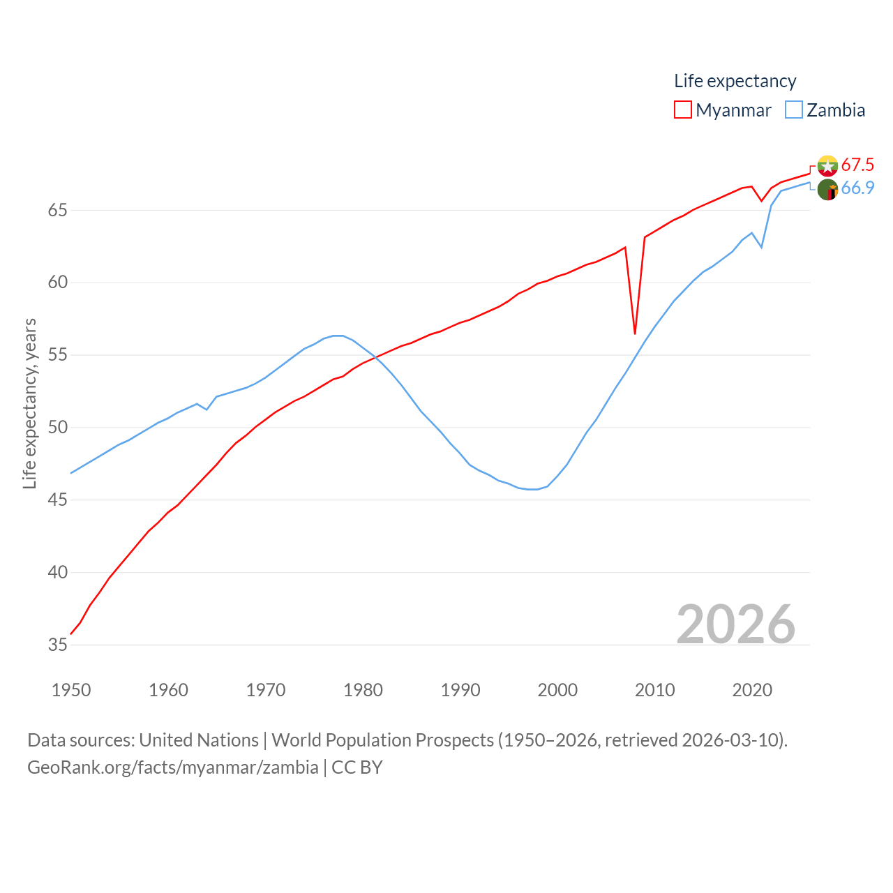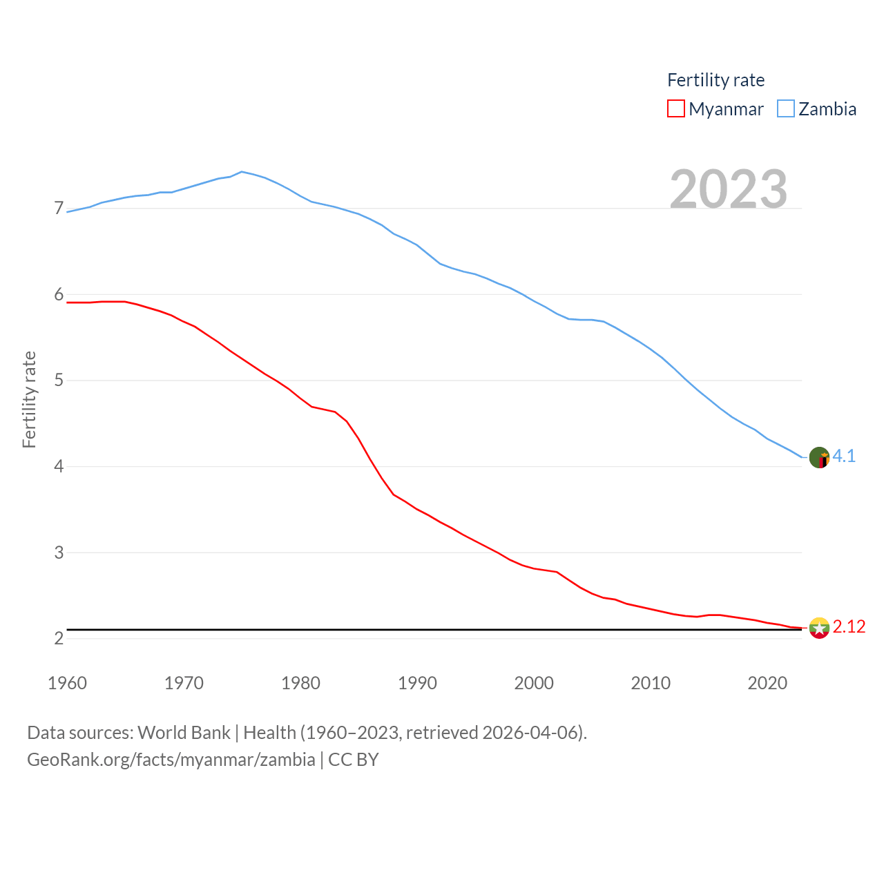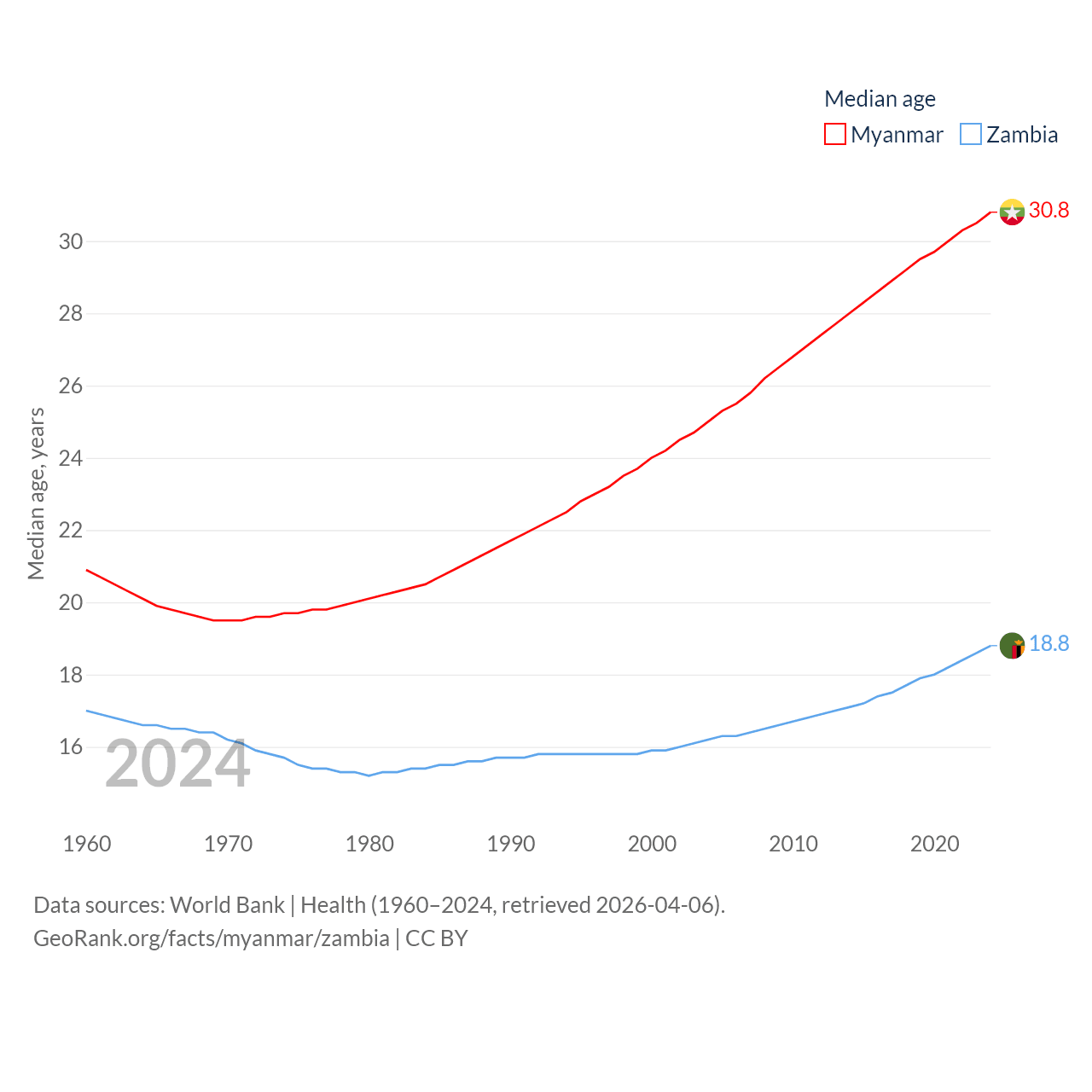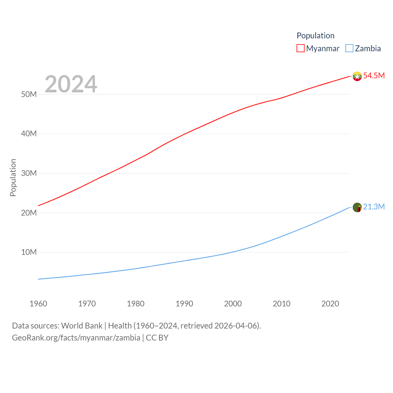 Myanmar has a population of 54.5M (ranked 27/197), compared with 21.3M in Zambia (ranked 63/197). Myanmar's land area is 251,997 sq mi versus 287,024 sq mi for Zambia (ranked 39th vs. 37th).