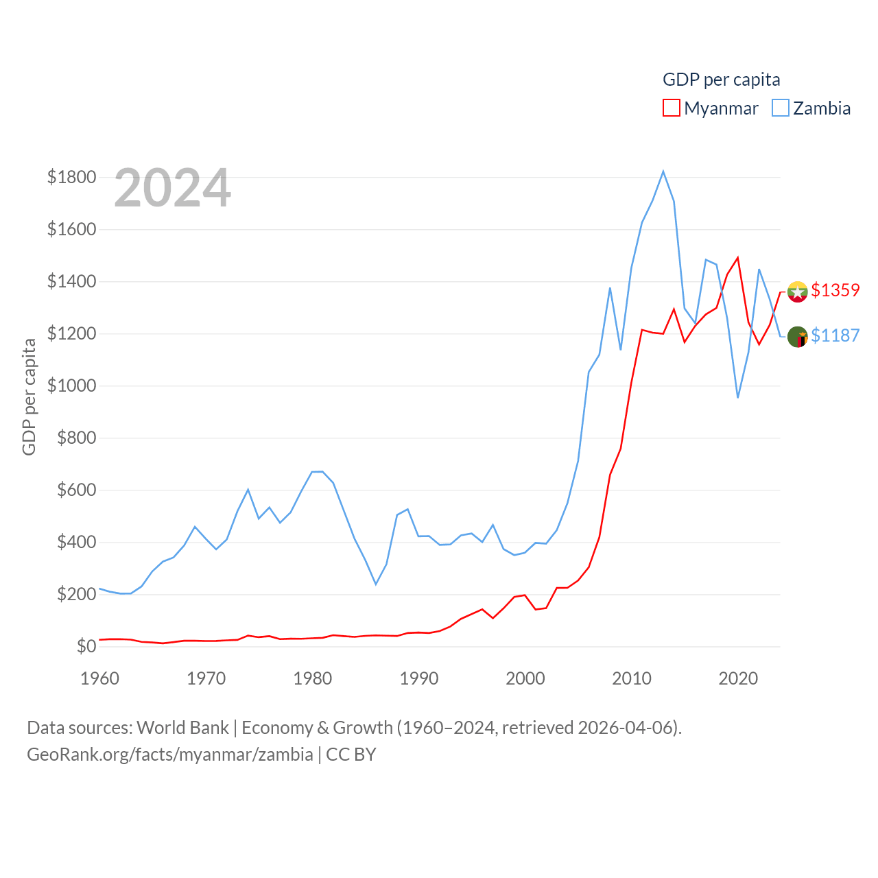 By GDP, Myanmar ranks 85/197 ($74.1B) and Zambia ranks 116/197 ($25.3B). By GDP per capita, Myanmar ranks 165/197 ($1,359), while Zambia ranks 169/197 ($1,187).
