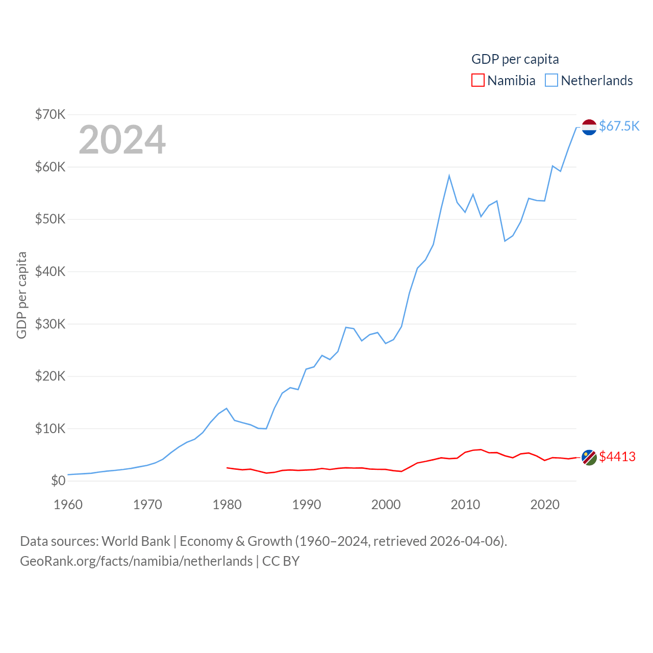 By GDP, Namibia ranks 147/197 ($13.4B) and The Netherlands ranks 19/197 ($1.21T). By GDP per capita, Namibia ranks 126/197 ($4,413), while The Netherlands ranks 13/197 ($67,520).
