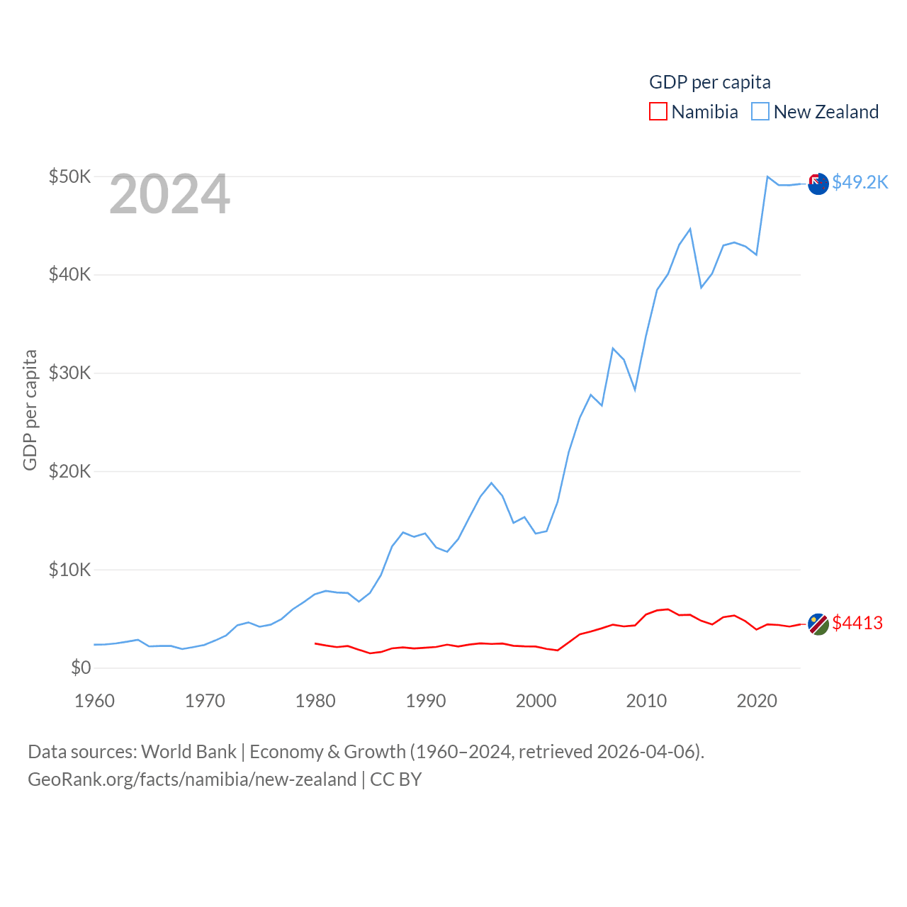 By GDP, Namibia ranks 147/197 ($13.4B) and New Zealand ranks 52/197 ($260B). By GDP per capita, Namibia ranks 126/197 ($4,413), while New Zealand ranks 26/197 ($49,205).