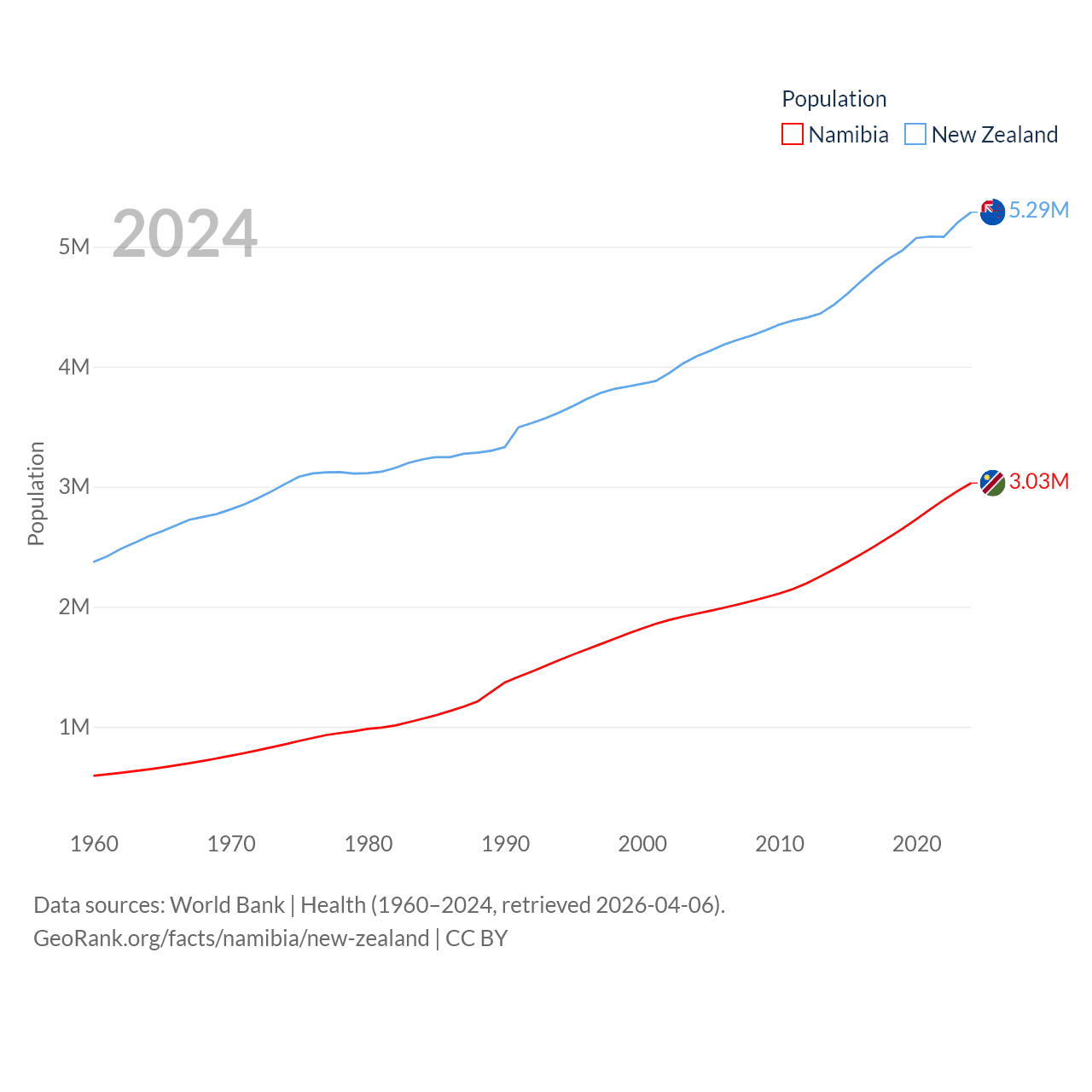 Namibia has a population of 3.03M (ranked 136/197), compared with 5.29M in New Zealand (ranked 123/197). Namibia's land area is 317,874 sq mi versus 101,665 sq mi for New Zealand (ranked 33rd vs. 74th).