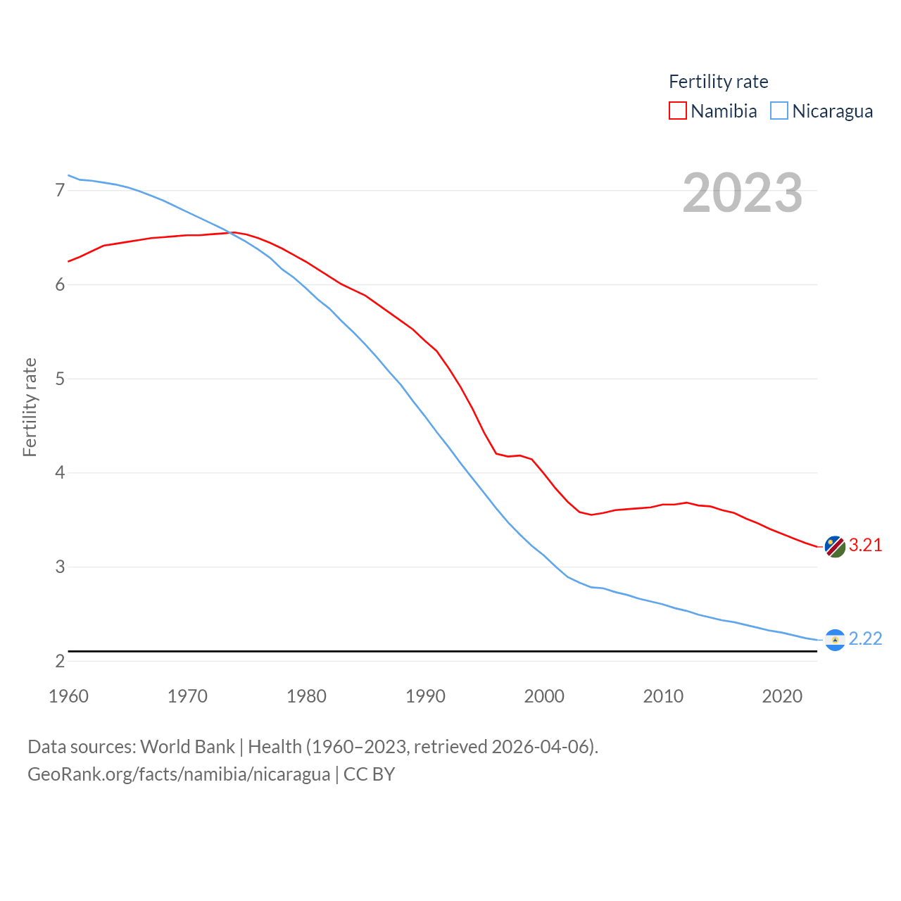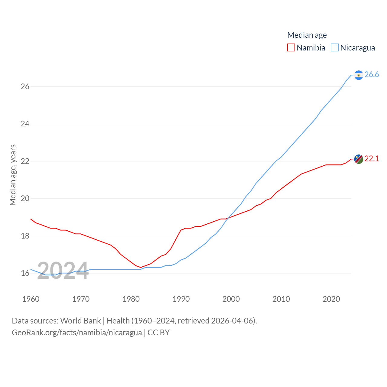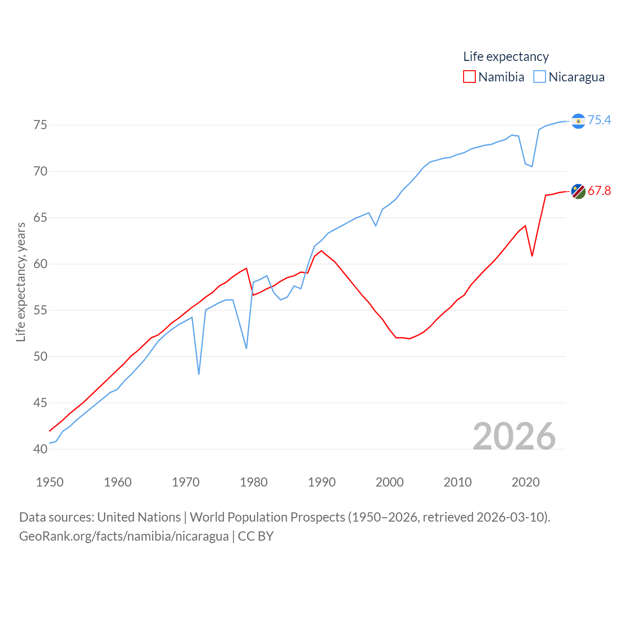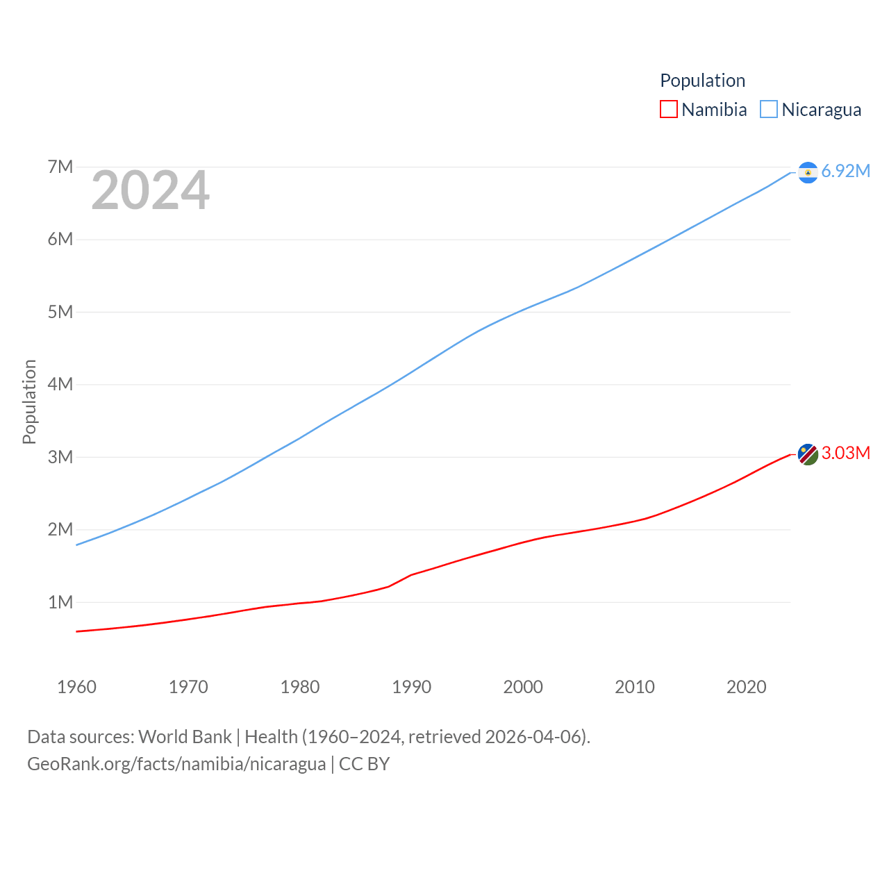 Namibia has a population of 3.03M (ranked 136/197), compared with 6.92M in Nicaragua (ranked 108/197). Namibia's land area is 317,874 sq mi versus 46,464 sq mi for Nicaragua (ranked 33rd vs. 98th).
