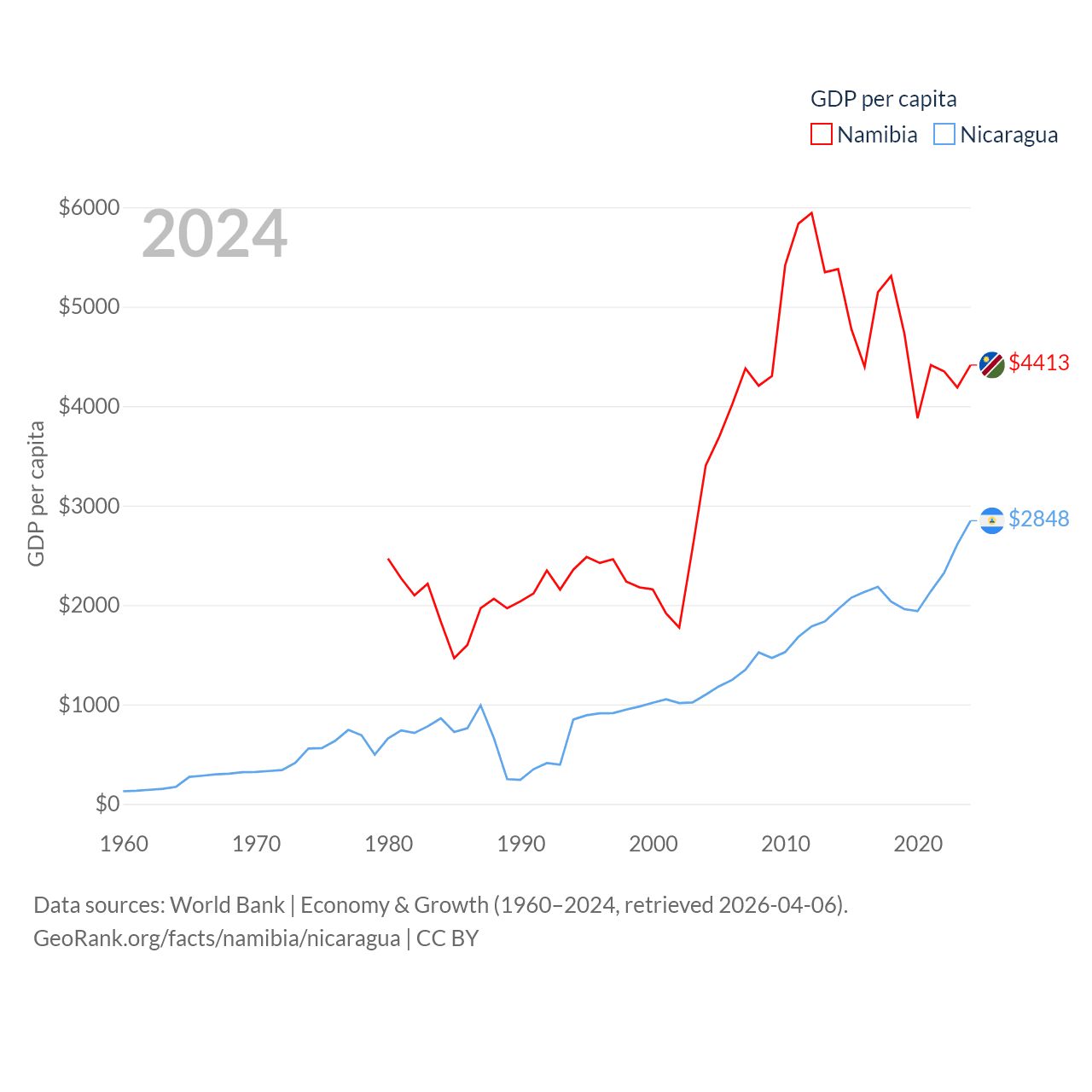 By GDP, Namibia ranks 147/197 ($13.4B) and Nicaragua ranks 131/197 ($19.7B). By GDP per capita, Namibia ranks 126/197 ($4,413), while Nicaragua ranks 141/197 ($2,848).